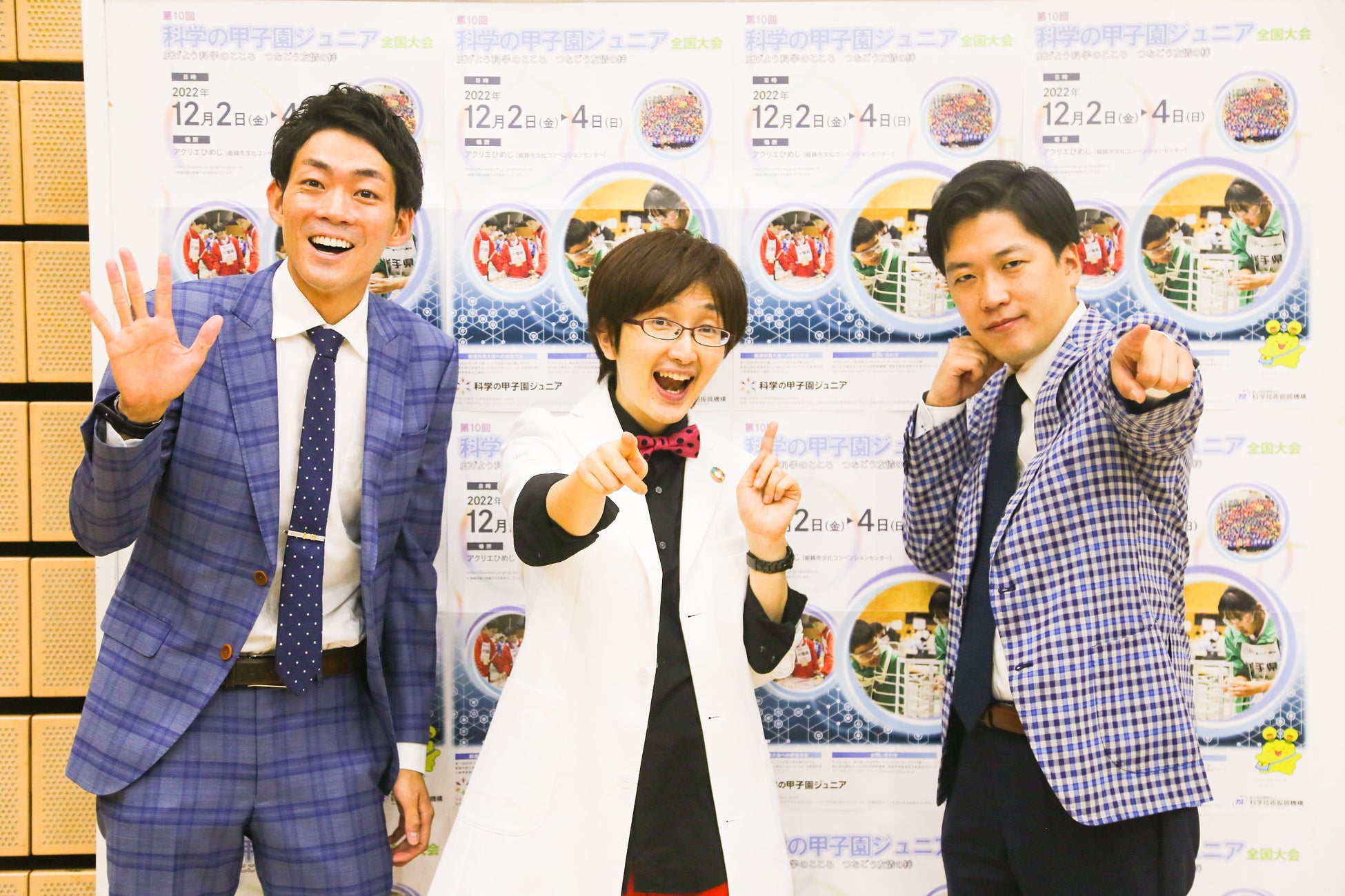 国立研究開発法人 科学技術振興機構(理事長:橋本 和仁)は、全国の中学生が都道府県を代表して科学の力を競う「第10回科学の甲子園ジュニア全国大会」を令和4年12月2日(金)~4日(日)、兵庫県のアクリエひめじ(姫路市文化コンベンションセンター)で開催します。同大会に出場する兵庫県代表チーム選考会として8月19日(金)に神戸常盤アリーナ(兵庫県立文化体育館)で開催された「数学・理科甲子園ジュニア2022」に、サプライズゲストとして吉本興業所属の黒ラブ教授とネイビーズアフロの2組が登場し、全国大会を目指す生徒たちに笑いのエールを送りました。