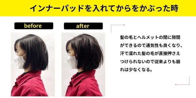 当製品では頭とヘルメットの間を少しだけ浮かせるような髪型保護用のインナーパッドを用意し、髪型崩れをできるだけ起こさないように工夫いたしました。