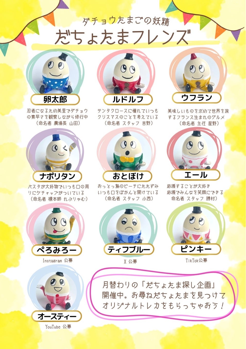 牧場のふれあいエリアには、ダチョウの妖精「だちょたまフレンズ」が隠れています。ショップで掲示されている手配書を参考に、「だちょたまフレンズ」を探し出しましょう。探し出した方には当牧場よりオリジナルトレーディングカードを差し上げます。