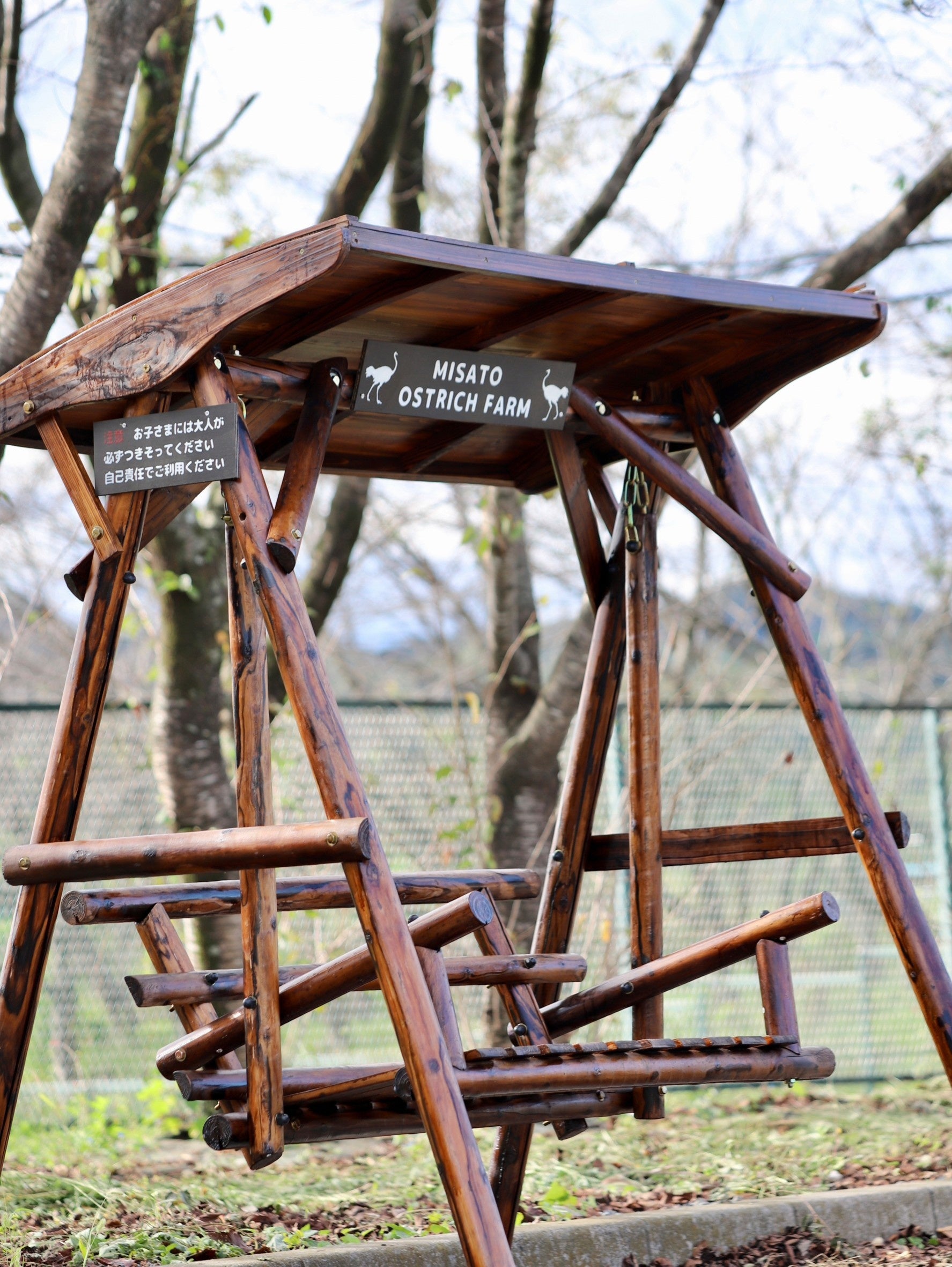 ふれあいエリアを一望できる見晴台を設置しました。ふれあいエリアにいる三羽のダチョウたちの動きを上から眺めることができます。ダチョウたちは普段私たちの上に顔がありますが、見晴台に上ってダチョウを観察してみてください。また違った印象をもつかもしれません。