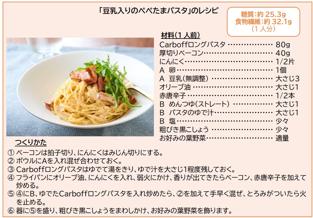 CMで有村さんが料理している「豆乳入りのぺぺたまパスタ」のレシピは、ホームページレシピサイトおよび、「Carboff」特設サイトなどで公開中です。