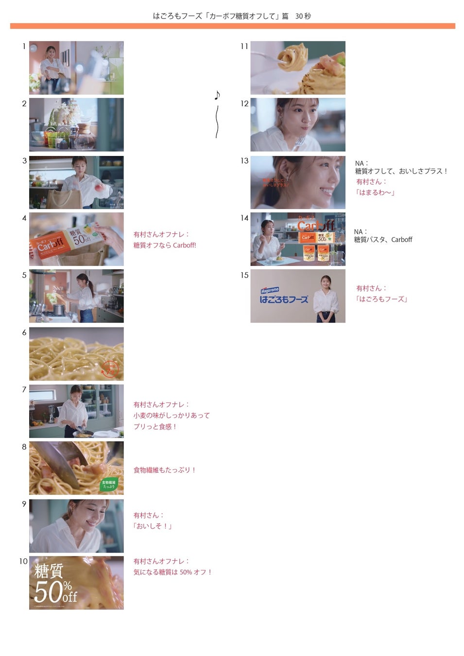 新CMは、買い物帰りの有村さんが、ウキウキ気分でキッチンに入ってくるシーンからスタート。買ってきた食材をバックから取り出し、その中には「Carboffロングパスタ」の姿も。早速、鍋でパスタをゆで、湯切りしたパスタと具材をフライパンで混ぜ、楽しそうに調理をする有村さん。そのいい香りに「おいしそう!」と満面の笑みを浮かべます。出来上がった「豆乳入りのペペたまパスタ」をお皿に盛り付け、ランチタイムへ。楽しみにしていたパスタを頬張り、そのおいしさに「はまるわ~」と満足げな表情を浮かべる様子が描かれています。