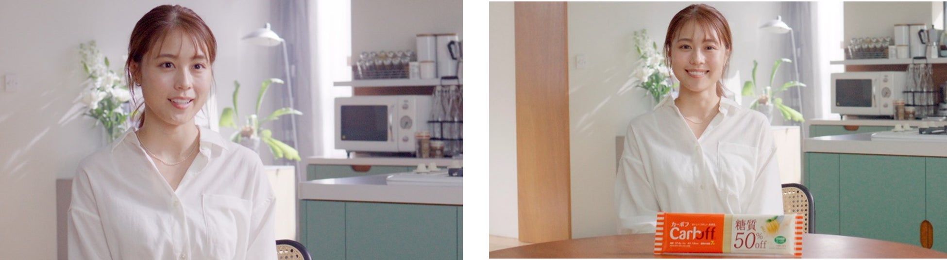 2月28日(水)から新たに始まる新CMでは、女優の有村架純さんが「Carboffロングパスタ」を使用して、おすすめレシピの「豆乳入りのペペたまパスタ」をつくります。糖質50%オフとは思えないおいしさに思わず笑みがこぼれる表情にご注目ください。