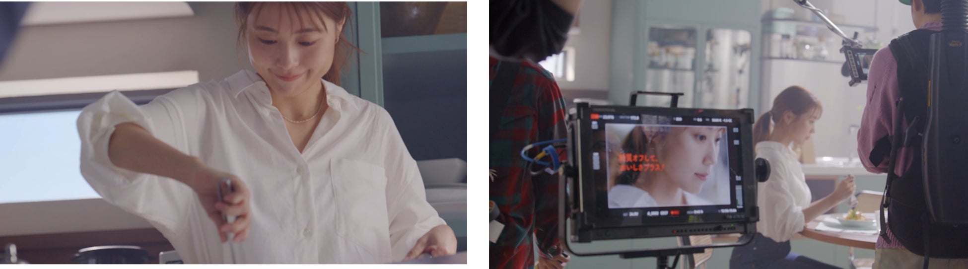 撮影当日、はつらつとした表情でスタジオ入りし、打ち合わせに臨む有村さん。普段から料理をしているということで、「豆乳入りのペペたまパスタ」をつくる撮影シーンでは、慣れた手つきで具材を炒め、きれいにお皿に盛り付ける姿を披露します。撮影もスムーズに進み、楽しげな有村さんの姿に、終始撮影現場も明るい雰囲気に。パスタを食べるカットでは、出来上がったパスタを前に目を輝かせ、にこやかな表情でパスタをおいしそうに頬張る表情が印象的でした。