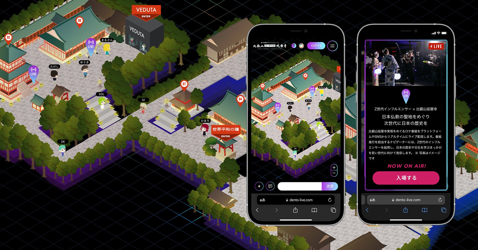 10月10日に比叡山延暦寺・阿弥陀堂で開催するオンラインイベント『比叡山延暦寺 VEDUTA COLLECTION × 伝燈LIVE』当日には、3つのライブ配信イベントへの入り口となるスポットが出現する予定となっており、メタバースをオンラインイベントのプラットフォームとして活用する試みに挑戦します。