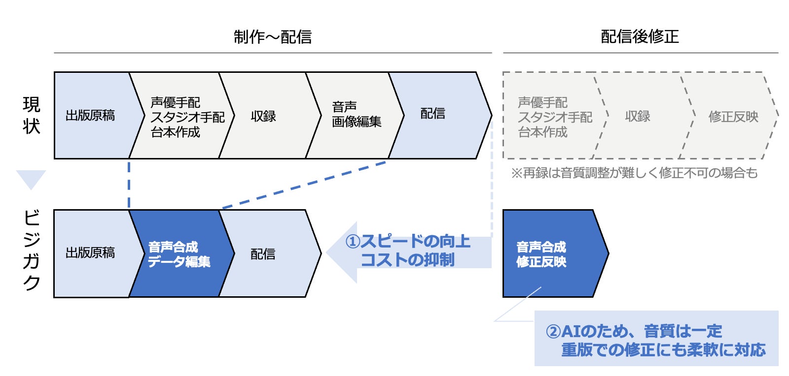 人の声による従来のオーディオブックは収録や制作に時間がかかります。それに伴い制作費も高く、限られた書籍しかオーディオブック化することができないという課題があります。ビジガクでは、最新のAI音声合成技術を活用することで収録にかかる時間とコストの削減に成功。さらに、配信後の修正や微調整にも柔軟に対応できるようになりました。以上の強みに加え、出版社と連携の強い印刷会社の立ち位置を活かし、書籍とオーディオブックの同時発売を可能にしていきます。今後はさらなる改良を重ね、電子書籍と同程度のコストで、多くの書籍がオーディオブック化できる世界を実現してまいります。