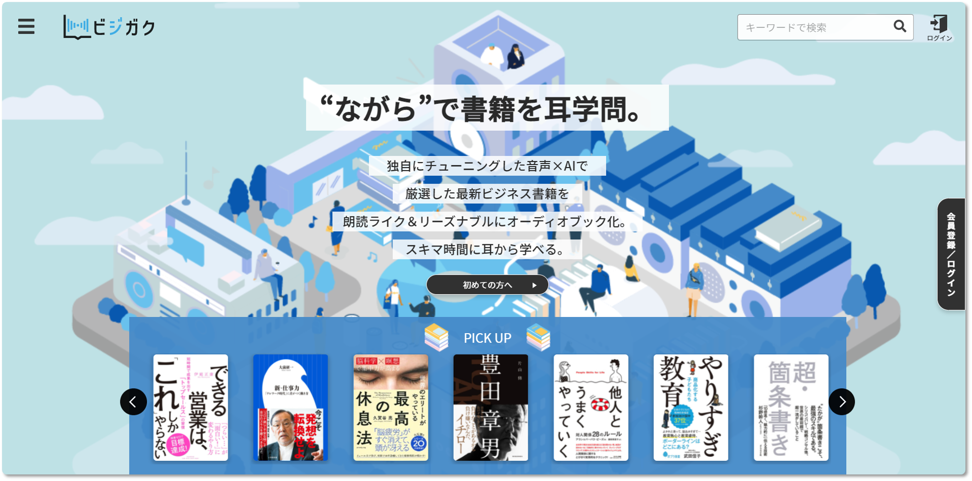 ビジネス書に特化したAI音声合成オーディオブック配信サービスです。コンセプトは『“ながら”で書籍を耳学問』。ビジネス+耳学を主軸としているため、「ビジガク」と名付けました。