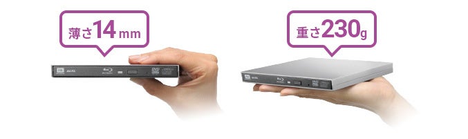 超薄型ドライブ採用で薄さ14mm、わずか230gの重さとなる「超薄型x超軽量」のポータブルブルーレイドライブです。筐体トップカバーにシルバー塗装を採用し、Apple製品と調和するスタイリッシュなデザインです。