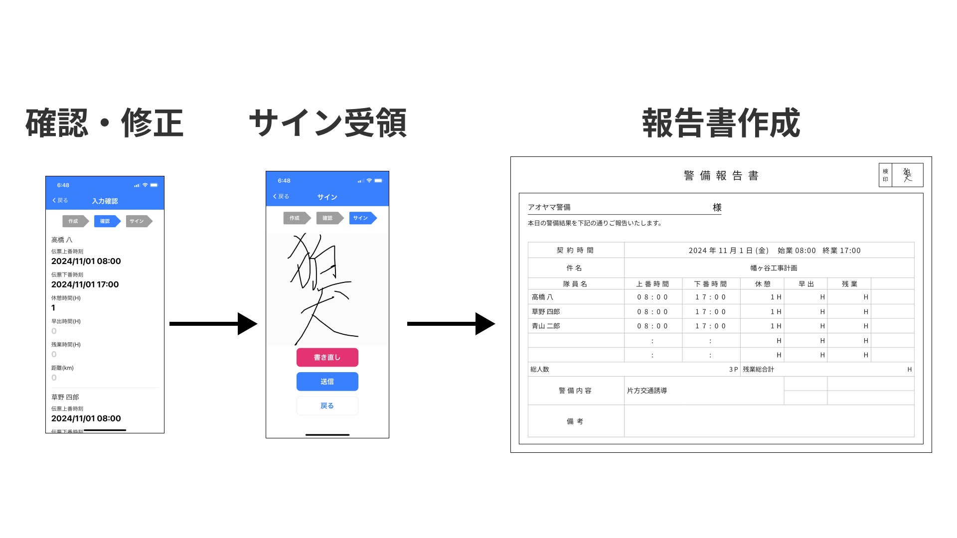 作成・回収の簡素化:KOMAINUにすでに管理されている現場情報を活用し、隊員は業務終了時に上下番時間や休憩を確認・修正し、現場でサインをもらうだけで、報告書がオフィスにリアルタイム送信されます。