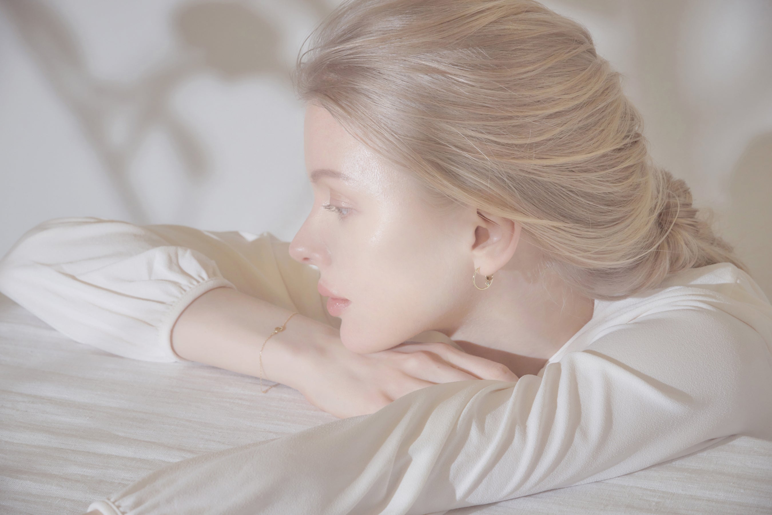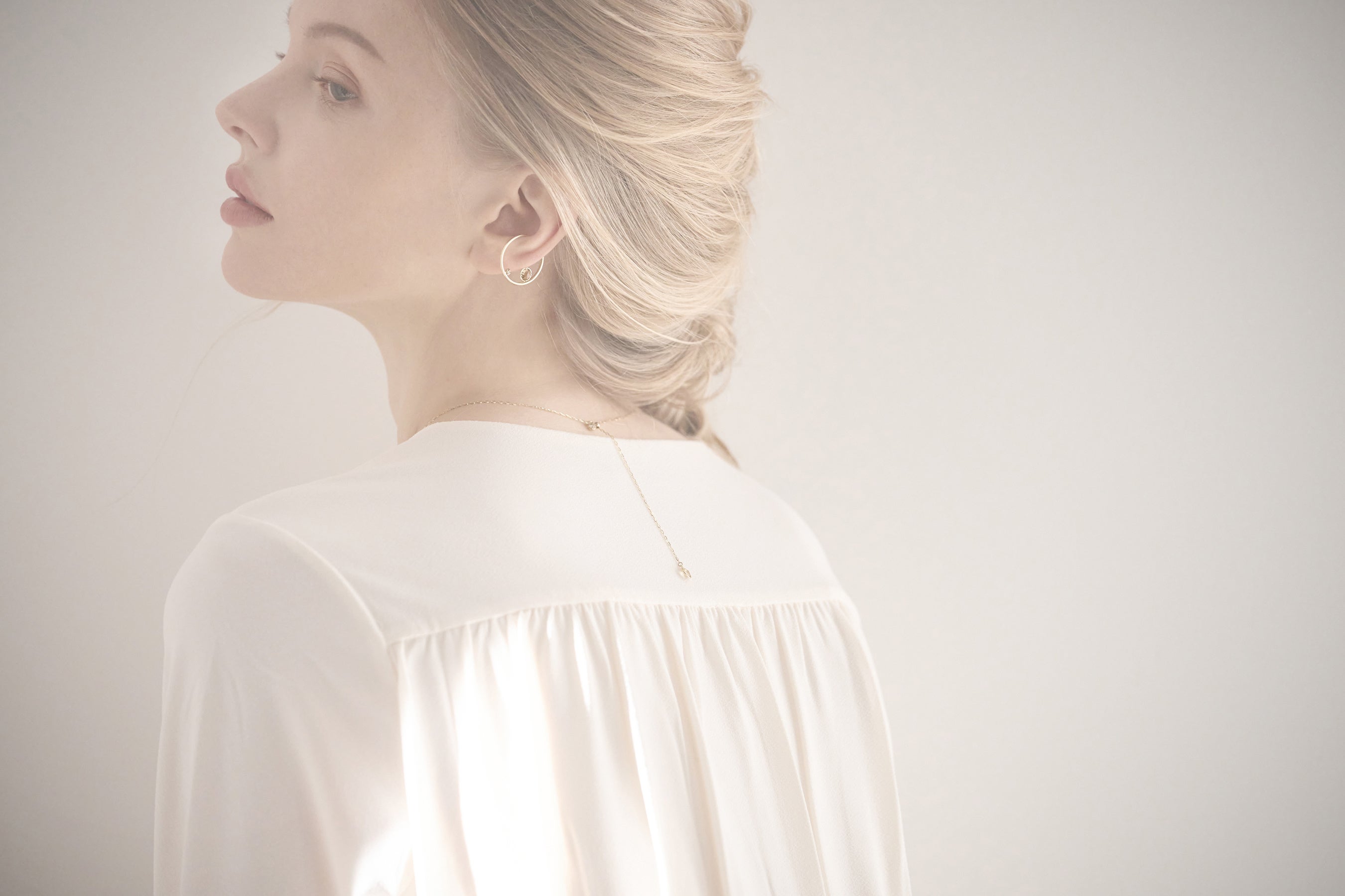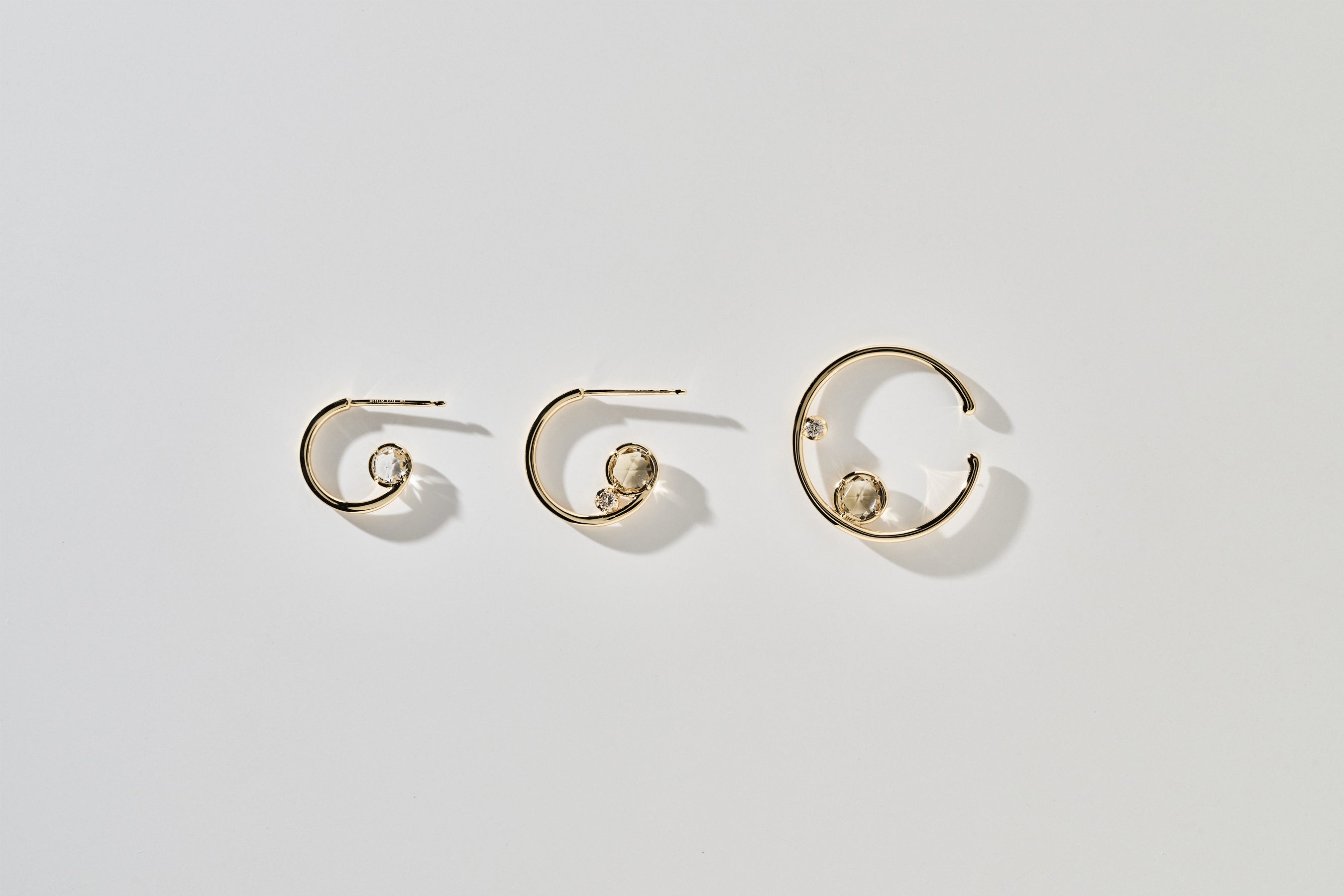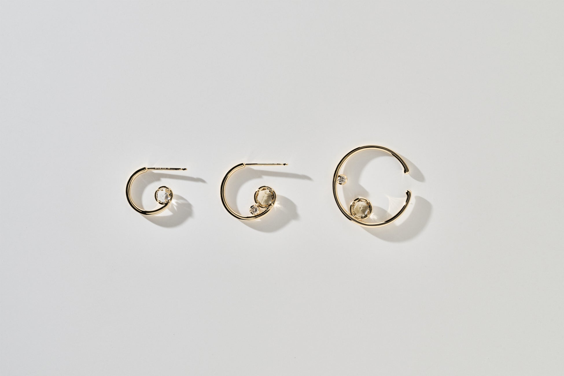 ミニマルを極限まで追求した洗練された美しいカーブにダブルローズカットのクリアカラーのクォーツを組み合わせたフープピアスです。そのシンプルなデザインはどんなシーンでも耳元を優しく演出し、身に着ける人全てに心地よさを運んでくれます。