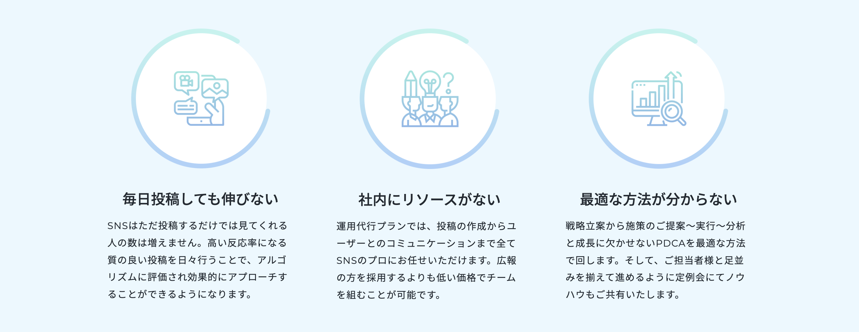 ファーストビューに、経営理念及び新ロゴのデザインを反映させたモチーフを配置。サイト全体は、ライトブルーを基調にした配色や丸みを帯びたデザインで「優しさ」と「誠実さ」を表現いたしました。また、SNS運用代行サービスの導入イメージがお分かりいただけるように、TOPページには、「運用実績」や「お客様の声」、「運用開始までの流れ」を、サービスページには、「選ばれる理由」や「プラン表」を設置しております。