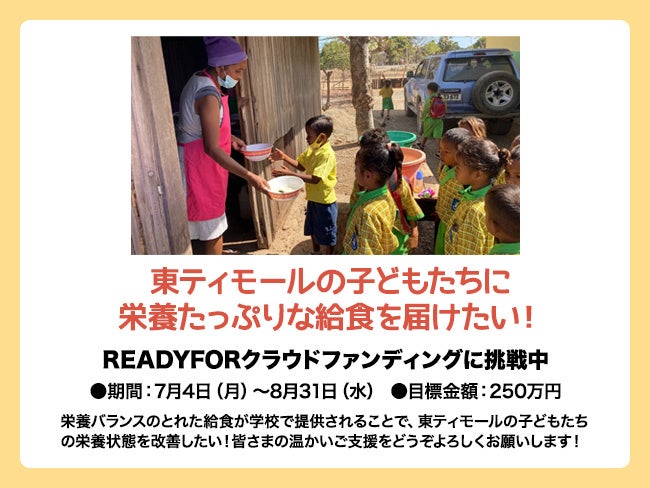 国際協力NGOパルシック(所在地:東京都千代田区、代表理事:穂坂光彦)は、5歳未満の子どもの47%が発育阻害の状態にある東ティモールで、地元食材を利用した栄養価の高いふりかけを使い、学校給食を通して子どもたちの栄養を改善するためのクラウドファンディングに挑戦します。募集期間は2022年7月4日(月)~ 8月31日(水)。目標金額は250万円です。