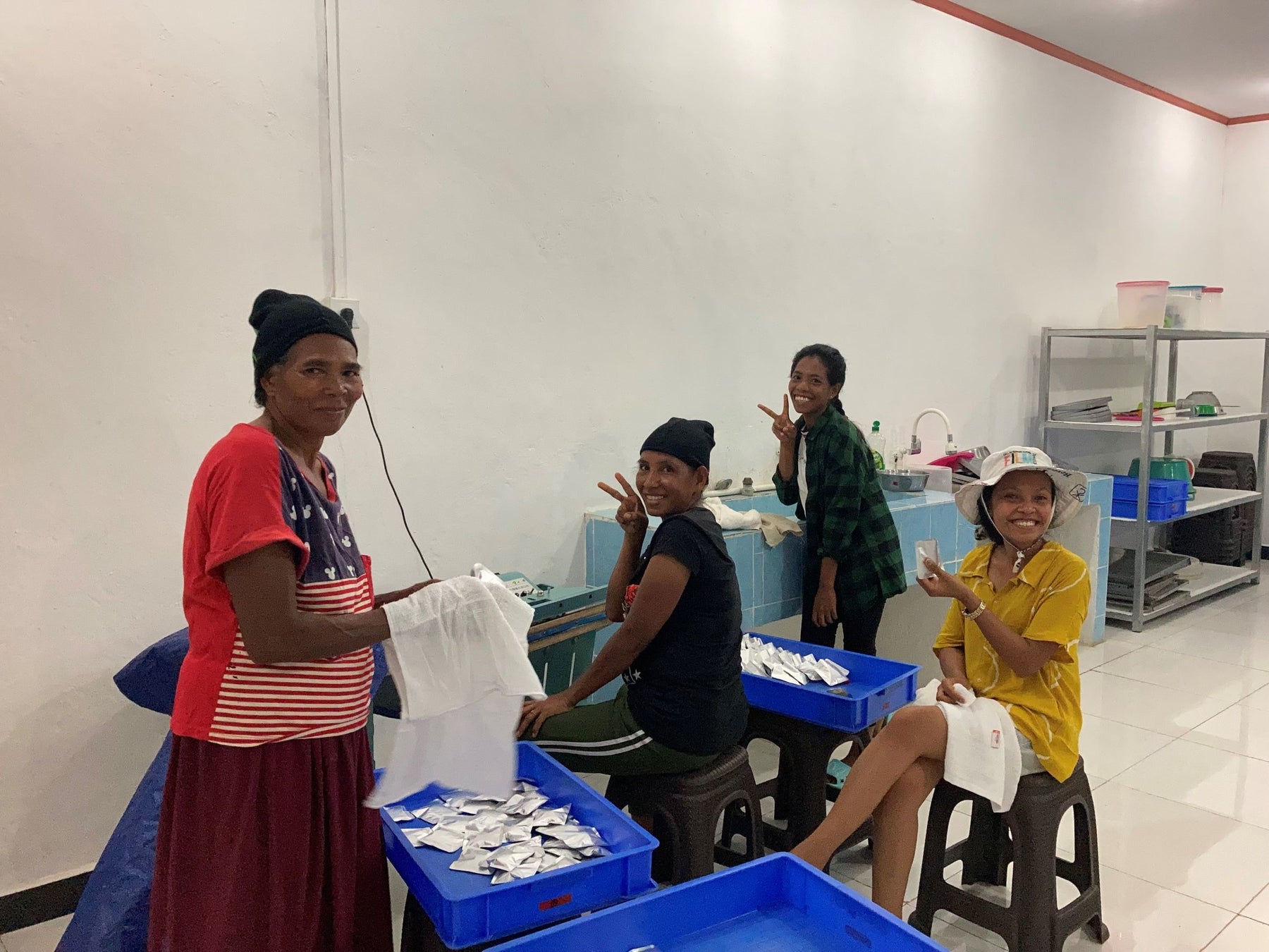 東ティモールは周囲を海に囲まれた海産物の豊富な国ですが、国内流通網が整備されていないため、山間部の一般家庭で魚が食卓に上ることはほとんどありません。そこで、漁業の盛んなアタウロ島に工場を作り、地元の漁業組合の女性たちと干し魚やモリンガなどを使った栄養価の高いふりかけを作り、商品化しました。給食に使うことで子どもたちの栄養改善につなげるとともに、市場を拡大し、ふりかけを生産する女性たちの収入向上も目指してきました。