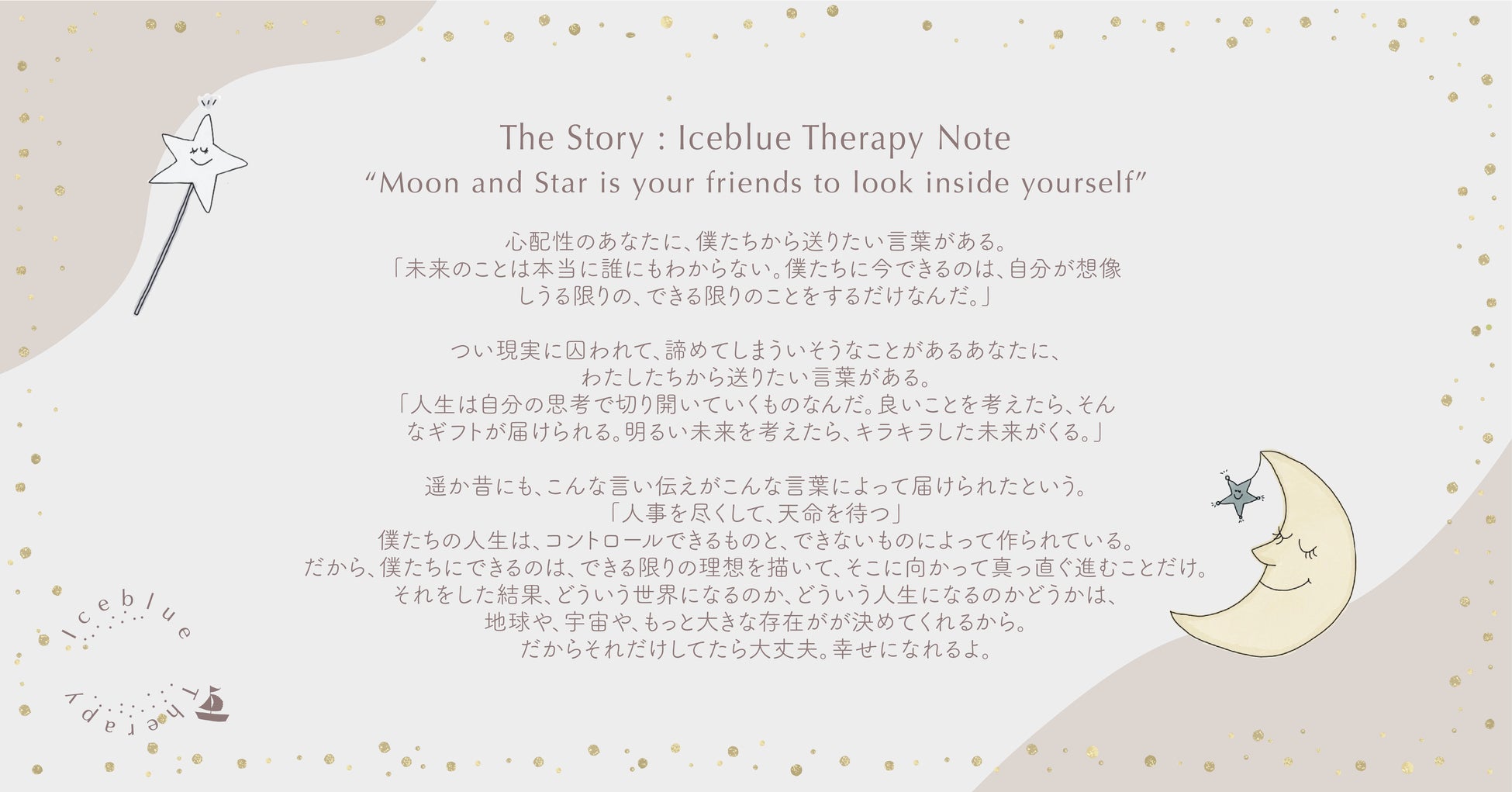 ご入会いただいたIceblue Therapy Memberさまには、毎月「Iceblue Therapy Note」と「Therapy Item- Moon Milk -」、「Therapy Event Tickets」が届きます。