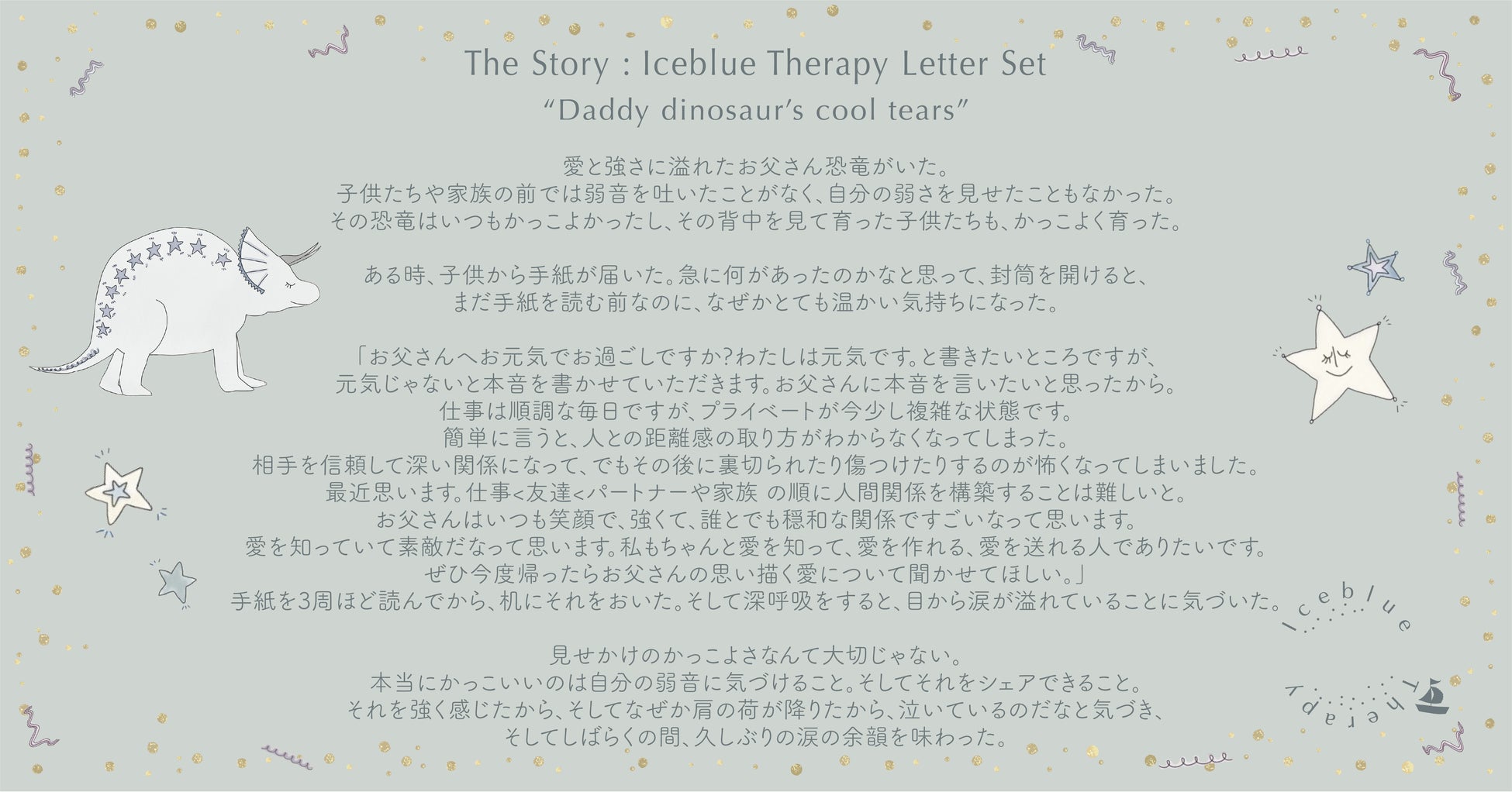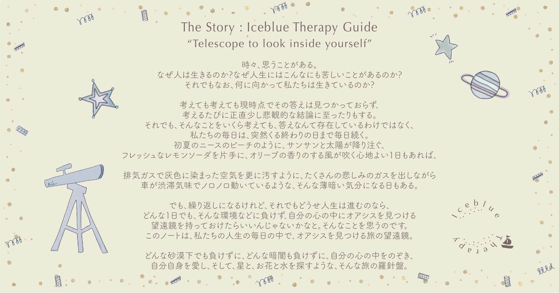 また、会員のみなさまにお送りする「Welcome Kit」は、「Iceblue Therapy Story Book」「Iceblue Therapy Guide」「Iceblue Therapy Letter Set」「Iceblue Therapy Card」の4つから構成されます。