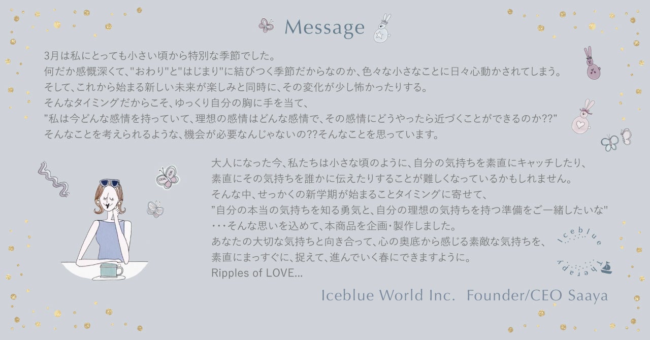 Iceblue World一同、皆さんと一緒に、小さなやさしさの波が、大波になっていく旅にこれから出かけられること、とっても楽しみにしています🐇♥