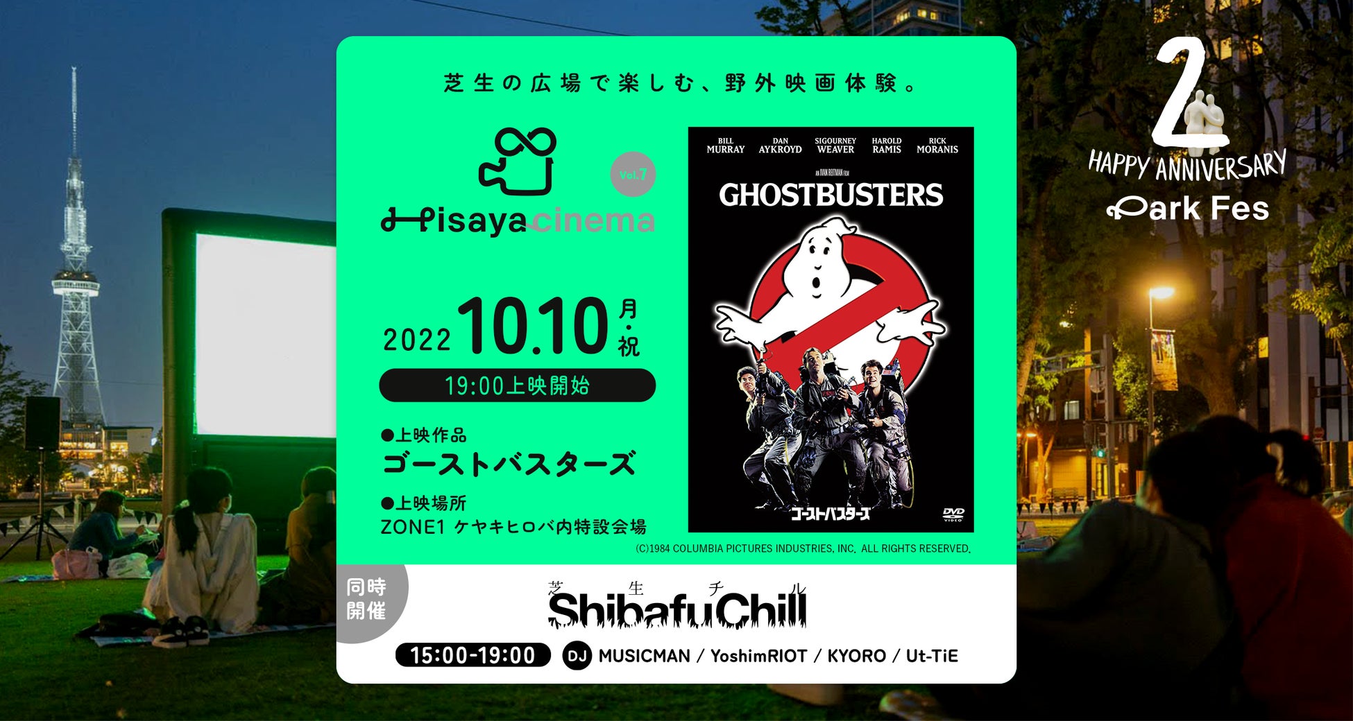 半年間、公園の中に月に一度登場した野外映画館「Hisaya cinema」。 10月10日が2022年最後の上映です。 上映映画は、ハロウィンにちなみ、世界中で大ヒットした「お化け」のコメディ映画『ゴーストバスターズ』。テイクアウトチケットやキャッシュバックキャンペーンなど、鑑賞者限定特典もご用意!さらに今回は、人気イベント「芝生チル」が会場のシバフヒロバを彩るBGMを担当します。