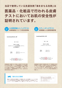 SavetheOceanの"海まもる洗剤"は肌に良いことを証明するために、第三者機関でスティンギングテスト、パッチテストを実施し、合格しています。 また環境負荷が少ない事を証明するために、OECD基準の生分解性テストで89.2%と高い基準でクリアしています。その他8つのエビデンスを取得しています。 洗浄力はプロのクリーニングが現場で実際使われているほどです。 クリーニング店側のメリットとしても1回あたりのコストダウンが可能なうえ、独自の洗いのプログラムで洗浄力アップを実現している点があります。この取り組みに賛同頂いているクリーニング店は、静岡:ホワイトウィングス社、兵庫:英国屋社など、全国で約200店舗が導入頂いております。