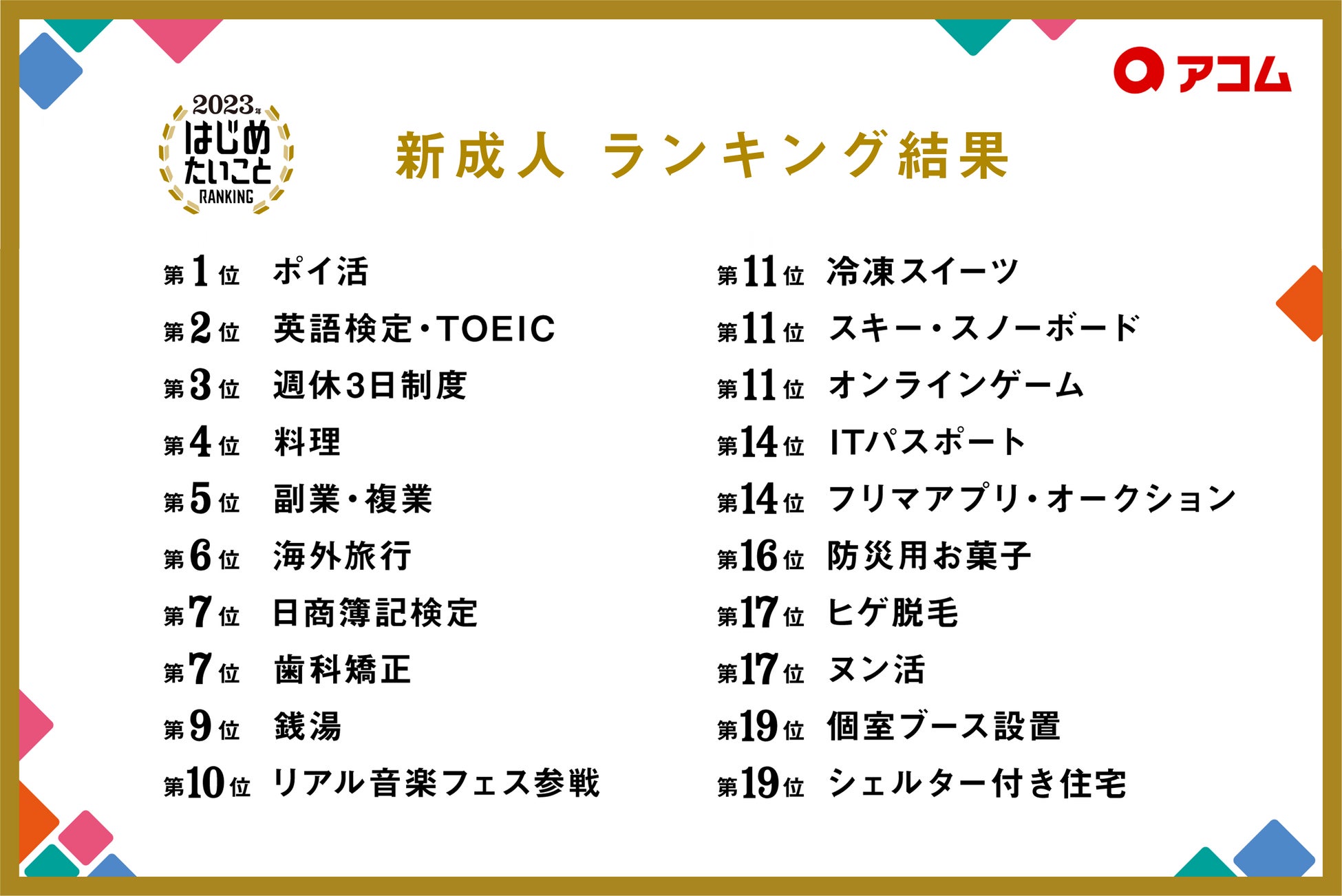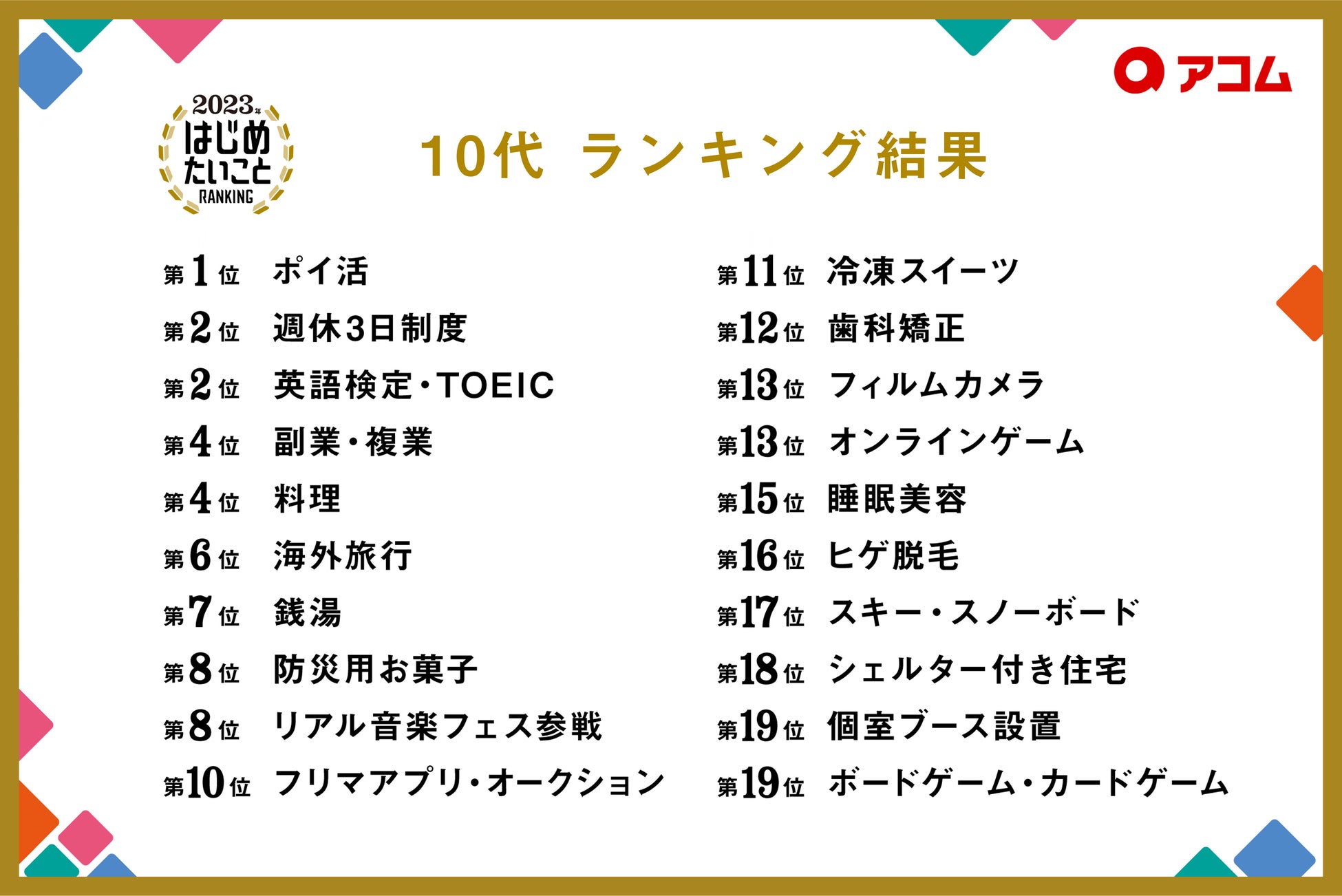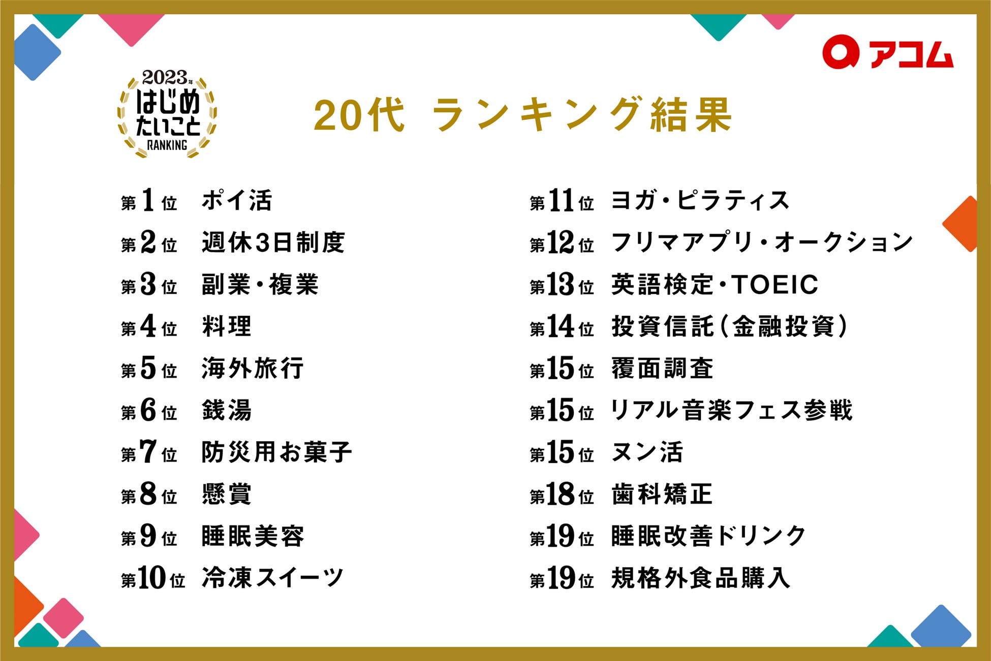 アコム株式会社(本社:東京都港区、代表取締役社長:木下政孝)は、日本全国のみなさん(10代~60代)に調査した「\はじめたいこと見つけよう!/2023年 はじめたいことRANKING」を発表します。