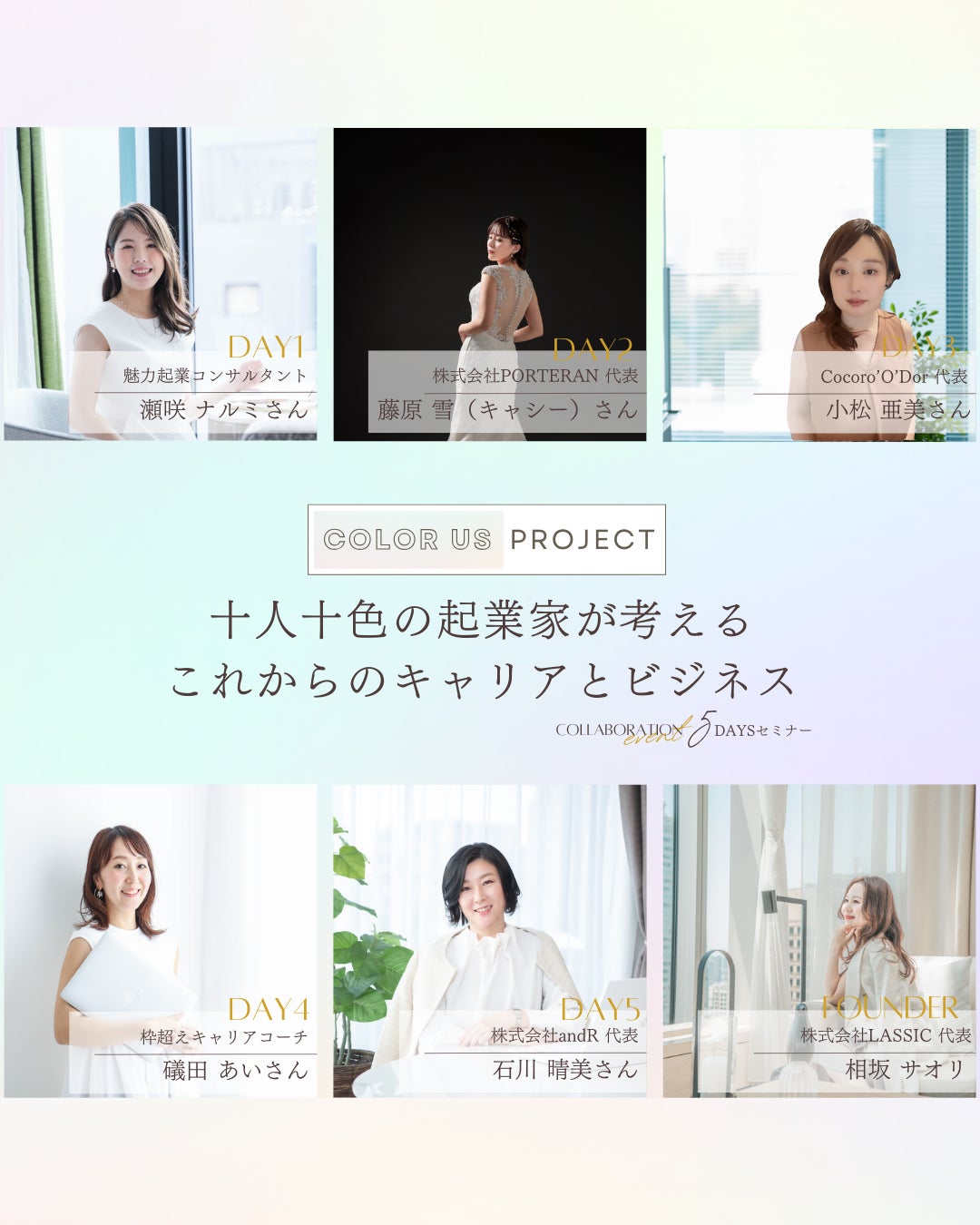 女性のキャリアとビジネス支援を行う株式会社LASSIC(本社:東京都港区南青山2-2-15 WIN青山531 代表取締役:相坂サオリ)は、『COLOR US PROJECT~十人十色の起業家が考えるこれからのキャリアとビジネス~』を10月31日から11月26日までで合計5日間オンラインイベントを開催します。このイベントは、十人十色の起業家のこれまでとこれからのキャリアとビジネスを紐解き、参加者の方の未来へのヒントになることを目的に、主に女性を対象にしたものです。イベントでは、登壇者のこれまでのキャリアとビジネスのストーリーをお伺いし、女性のキャリア形成、ライフイベントとどう向き合うか、自分らしいビジネスの作り方などをテーマにトークセッションを行います。
