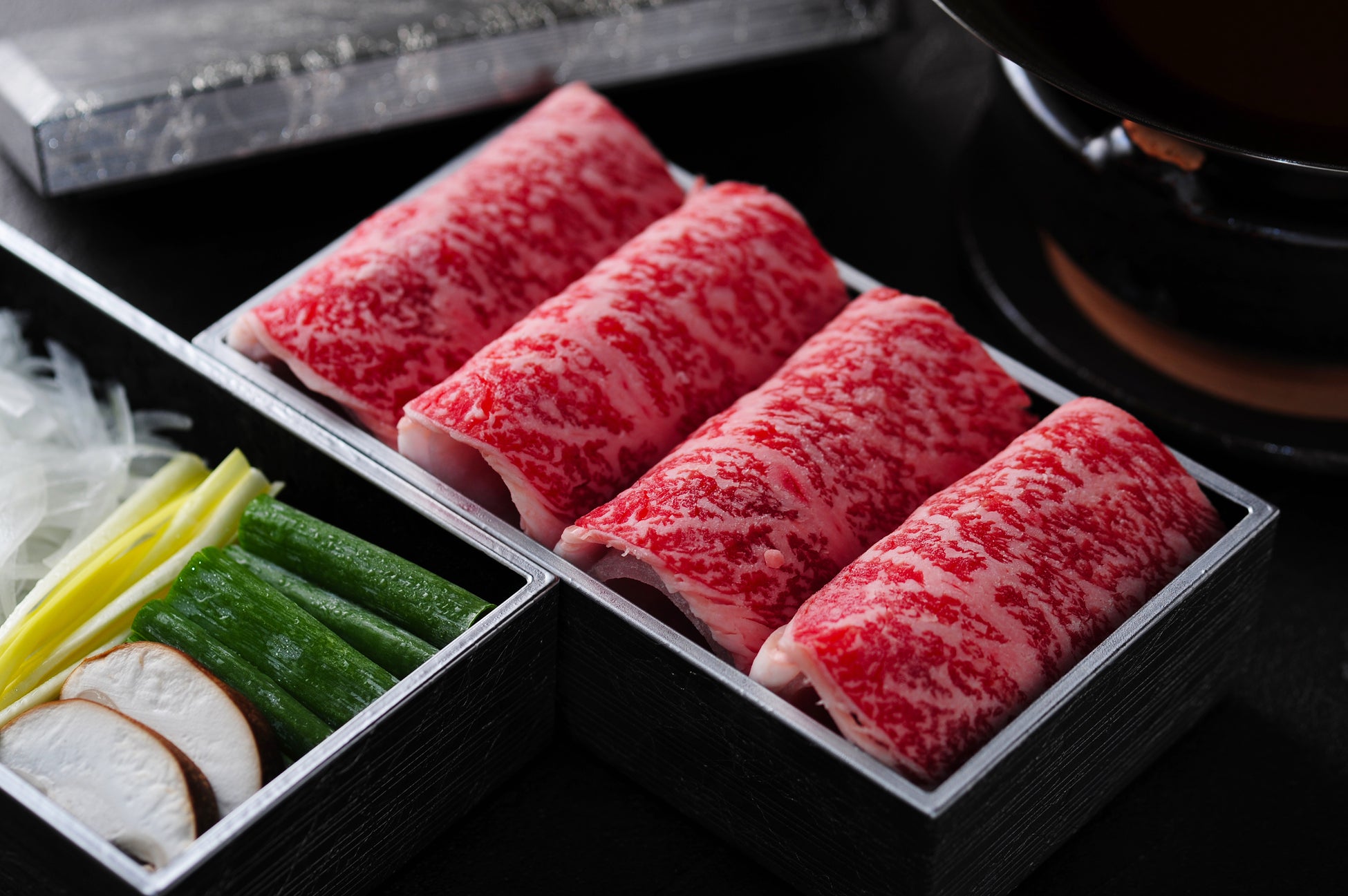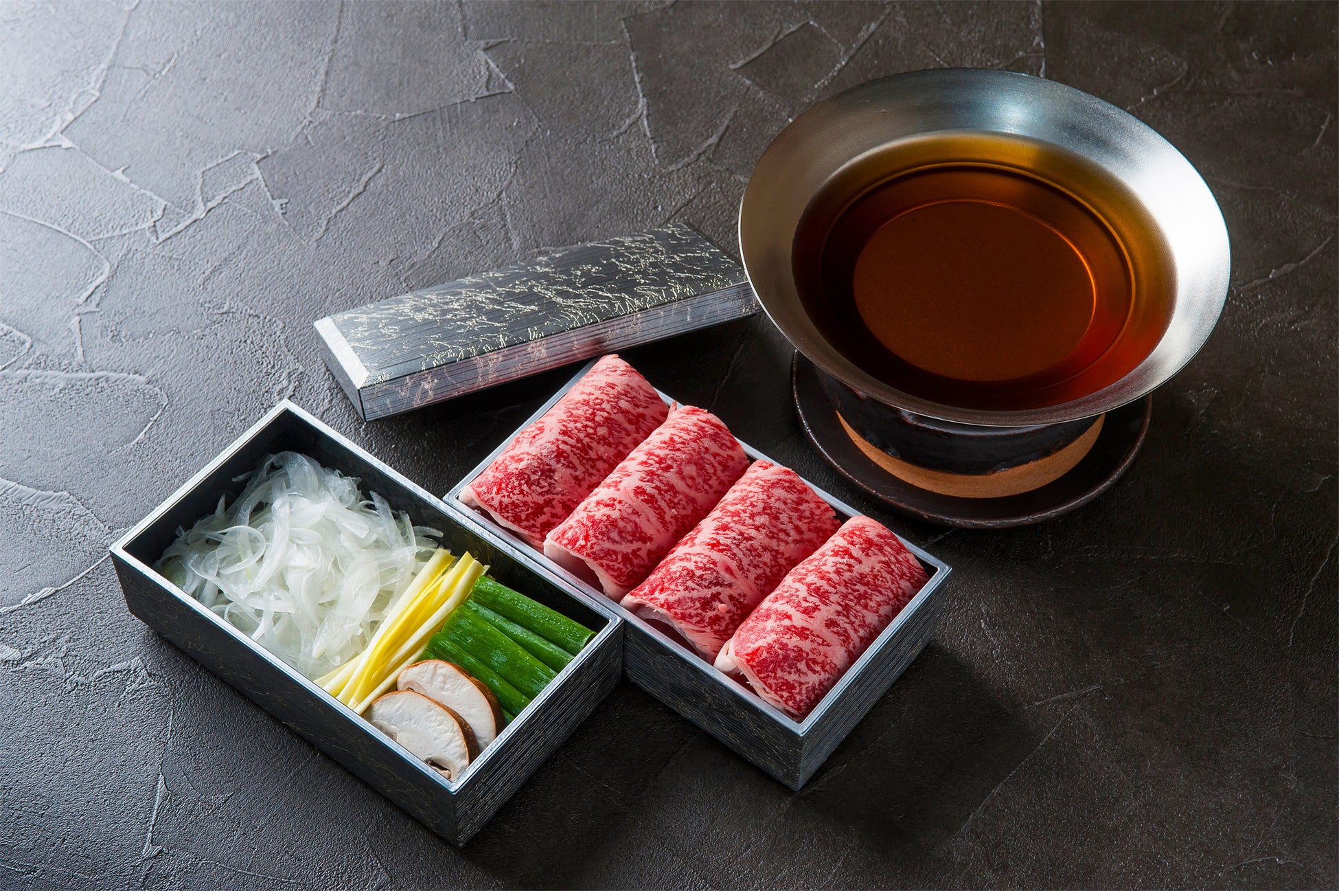 黒毛和牛本来の味を堪能できる最高品質の牛肉である石垣牛。肉質は脂身が多過ぎずさっぱりしていて、それとともに脂質は甘味のある風味豊かな味わいが特徴です。東山のすき焼用割下は牛肉に合わせて配合を変えており、石垣牛専用の割下は石垣牛の美味しさを最大限に引き出すため上白糖の分量を控え、赤酒を使用することによりさらっとした甘みに仕上げております。