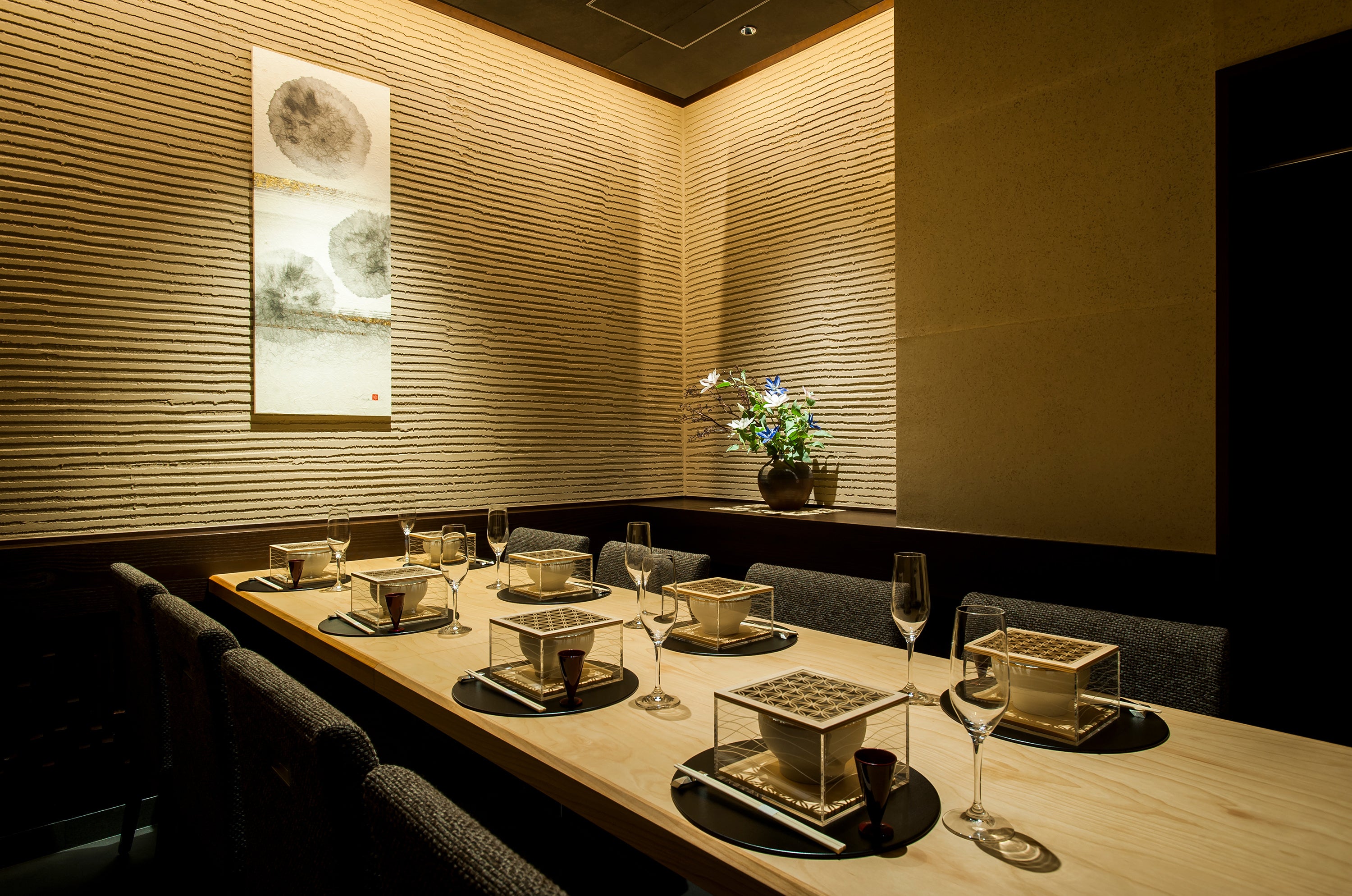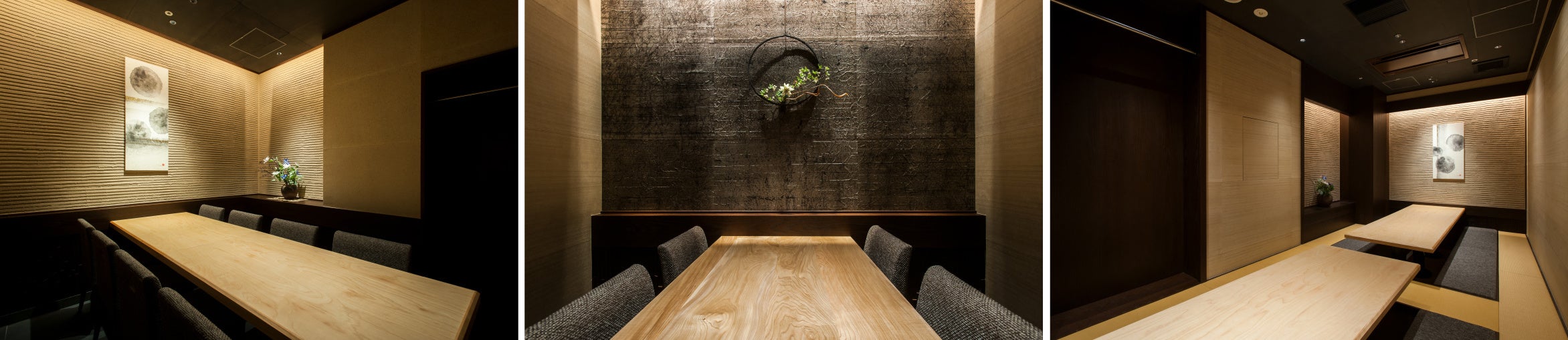 ご会食、記念日、ご両家の顔合わせなど様々なご用途に最適な全席完全個室。贅をつくした和のくつろぎと旬の味わい、都会の喧騒を忘れさせる静謐な空間でゆっくりとお過ごしください。