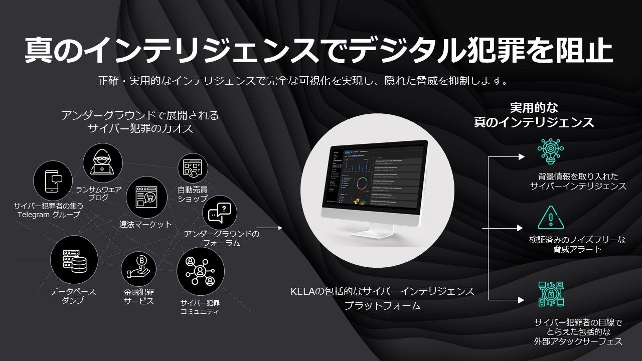 サイバー犯罪脅威インテリジェンス企業として数々の受賞歴を誇るKELAは、アンダーグラウンドのサイバー犯罪社会で生まれる脅威について、実用的なインテリジェンスを提供し、デジタル犯罪に対する防御を支援します。弊社の成功は、自動化された独自のテクノロジーと優秀なインテリジェンス専門家の類まれなる融合を礎としております。世界中のお客様から信頼される弊社のテクノロジーが、アンダーグラウンドの闇に潜入して徹底的な監視・調査を行い、デジタル犯罪のリスクを緩和することで、真の脅威を明らかにするとともに積極的な防御を実現します。