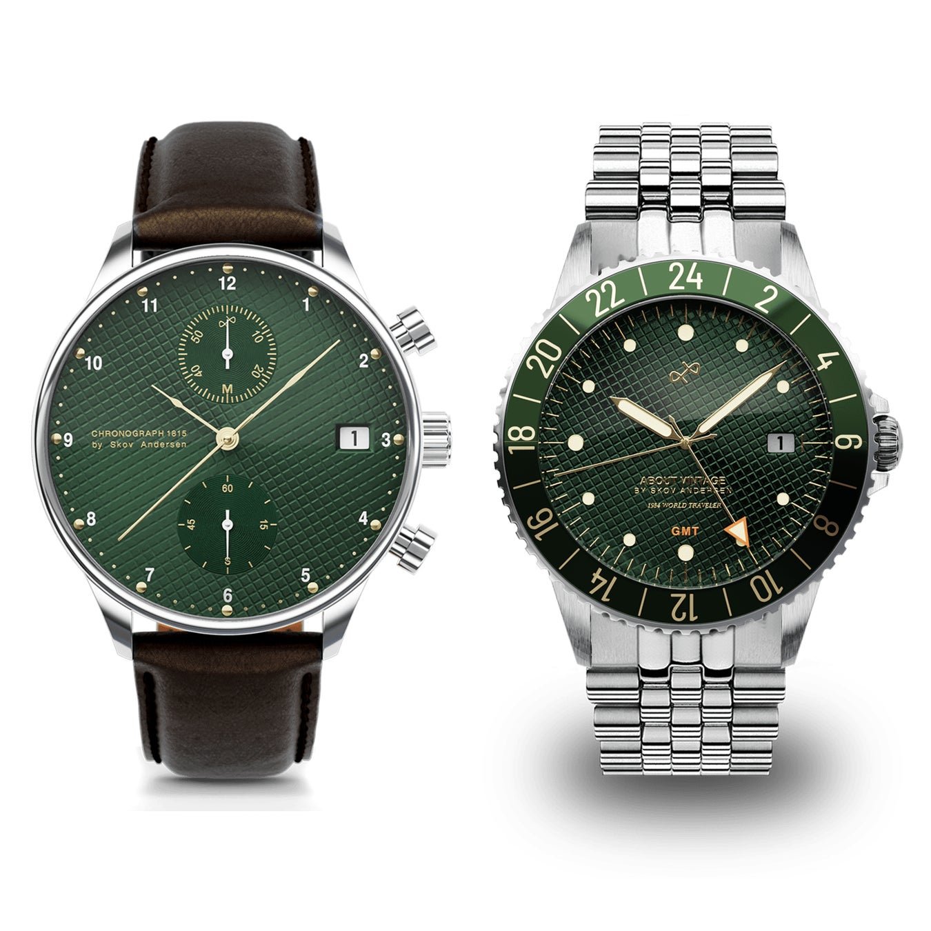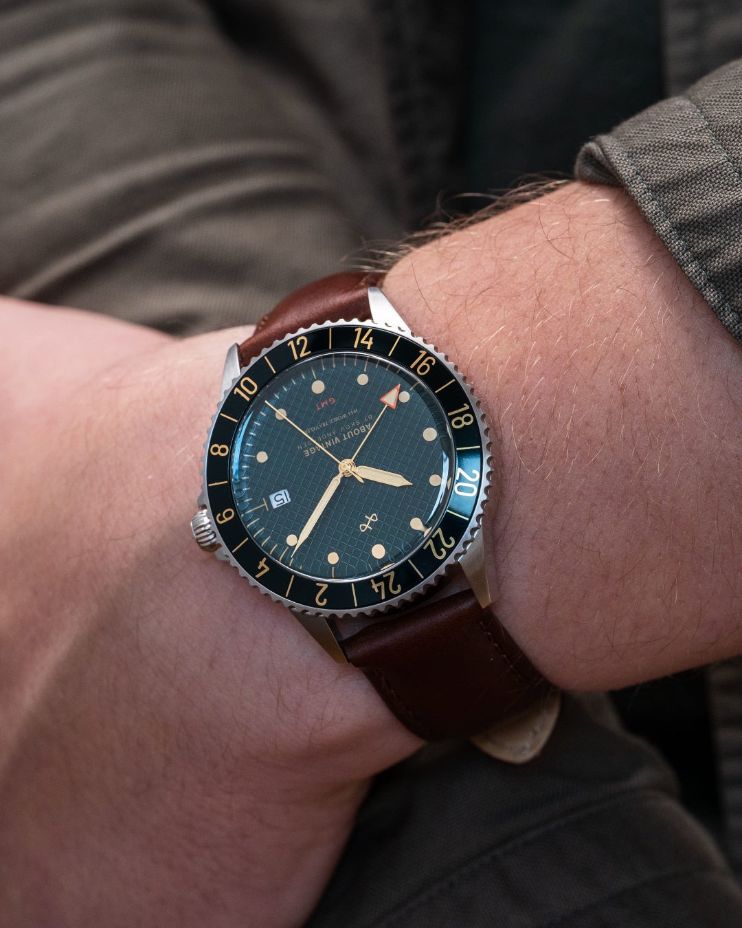 About Vintageのベストセラーウォッチ1815 Chronograph&価格以上の高級感で人気の1954 GMTウォッチにウミガメからインスパイアを受けた落ち着きと高級感を兼ね備えたグリーンタートル柄が3月27日(日)19時より新発売!