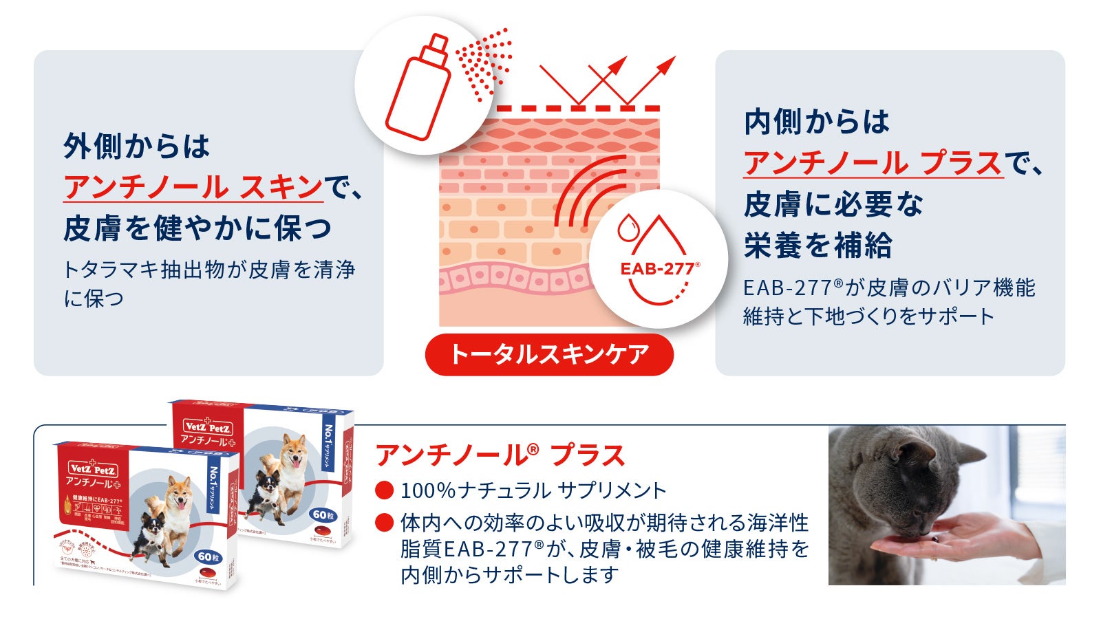 アンチノール プラスと併用することで、体の内外から皮膚・被毛の健康維持をサポート。外側からは、アンチノール スキンで、皮膚を健やかに保ち、内側からは、アンチノール プラスで、皮膚に必要な栄養を補給できます。
