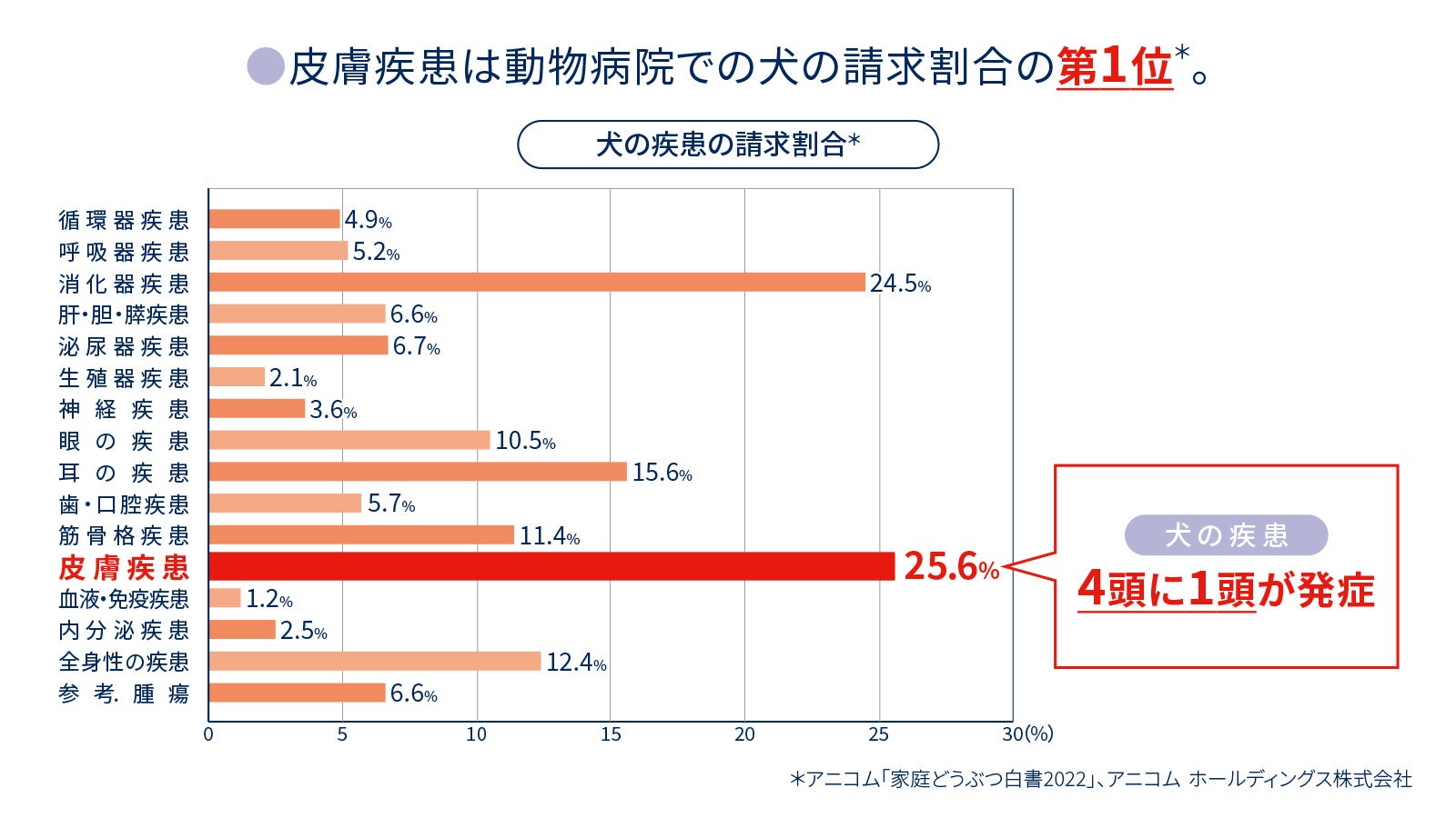 アニコム「家族どうぶつ白書2022」、アニコム ホールディングス株式会社によると、動物病院の犬の保険金請求割合第1位は「皮膚疾患」で、4頭に1頭が発症しています。