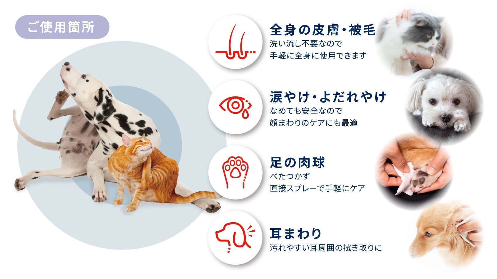 アンチノール スキンは大切なペットの毎日のスキンケアの「ナチュラル」「手軽」「安全」を実現する犬猫用のスキンケアスプレーです。ニュージーランド原産の針葉樹「トタラマキ」から抽出される天然由来成分で皮膚を健やかに保ちます。スプレーして馴染ませるだけで手軽さもあり、なめても安心な長期使用が可能な商品です。涙やけ・よだれやけ、足の肉球や耳周りまで、全身の皮膚・被毛に使用可能です。