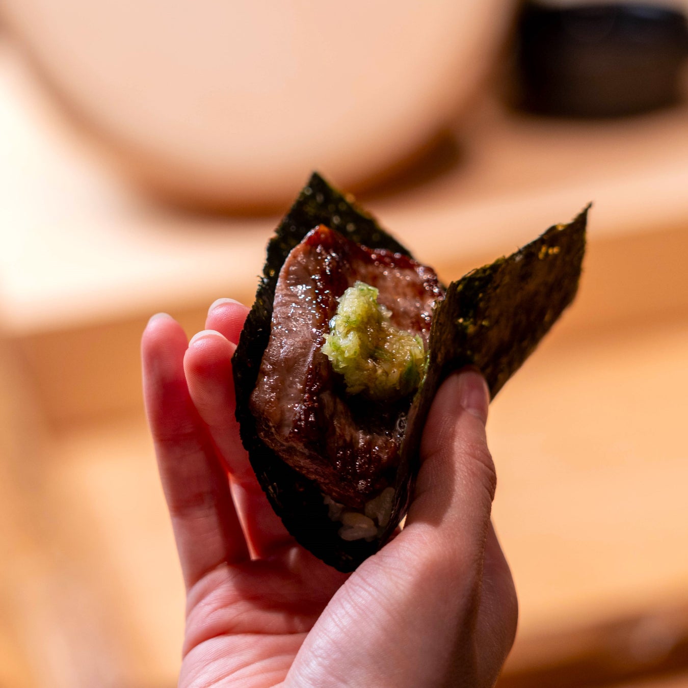 脂の旨味が滴るほどに丁寧に炙ったのどぐろをシャリと海苔で包みながら頂く人気の逸品。