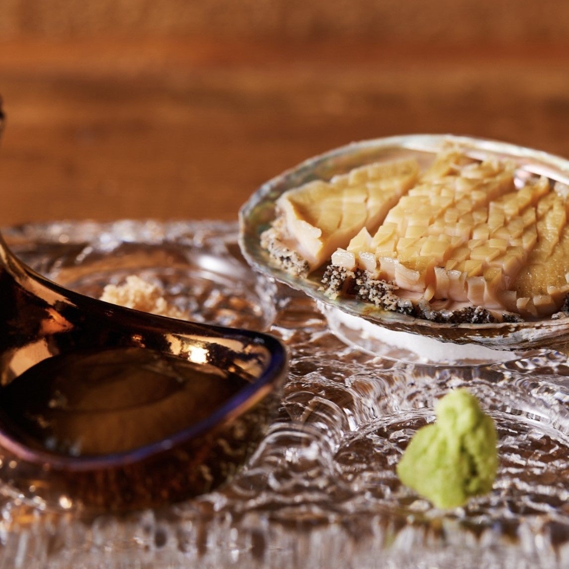 刺身にした鮑を殻に盛り付け、鮑の肝と醤で作った肝ソース、本生山葵、竹炭塩で味の変化を楽しみながら頂く贅沢な逸品。
