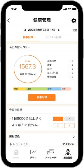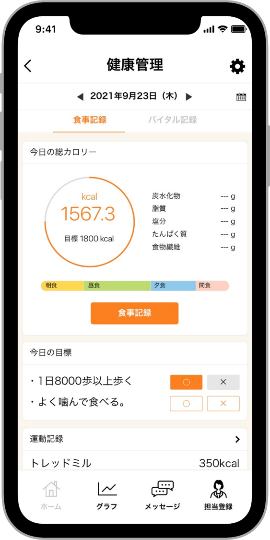 ・食事管理…食事の時間や写真、献立ごとのカロリーや栄養素を記録し、