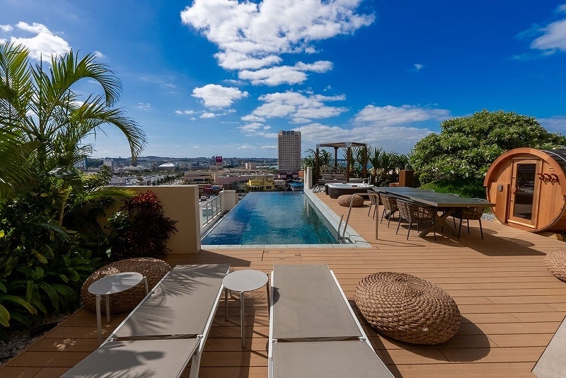 最大9名様まで宿泊可能なメゾネットタイプの特別なスイートルーム。バルコニーには、完全プライベートな屋外インフィニティプールやジャグジー、バレルサウナを設置しており、海や街並みや空を眺めながらくつろげます。客室には、沖縄では唯一天然温泉を引き込んだお風呂浴室もお部屋にあり、心ゆくまでリラックスいただけます。