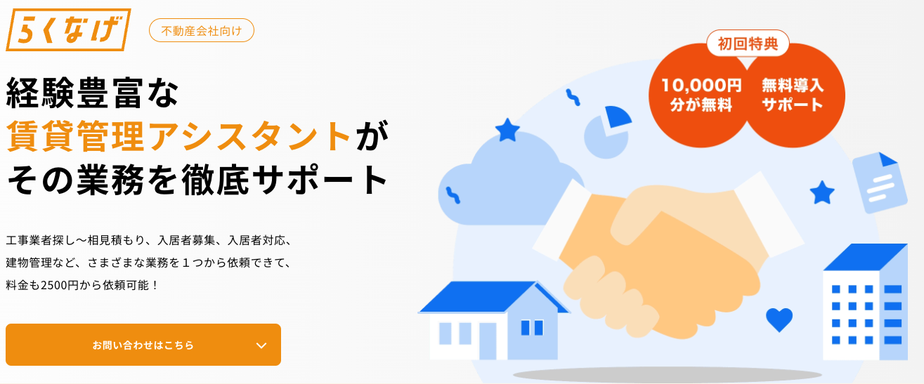 不動産経営で日々行われている賃貸管理業務や仲介業務のさまざまな面倒くさい業務を「1つ」からチャットで簡単に依頼できるサービスです。「らくなげ」では、月額費用なく、必要な時に必要な分だけ賃貸管理業務を「1つ」から解決するサービスです。(https://raqnage.oh-yeah.co.jp/)