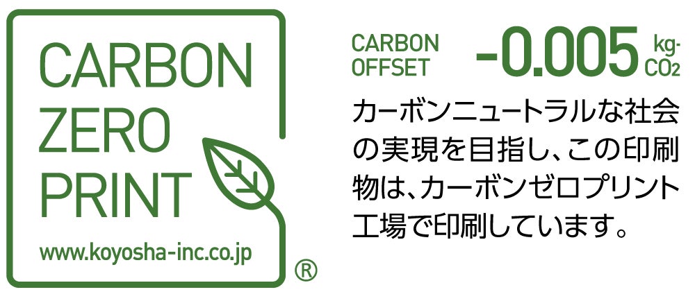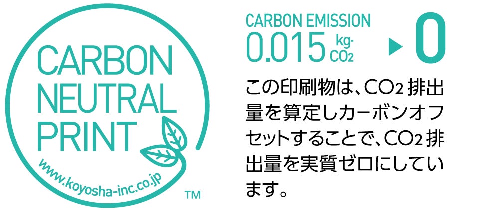 ※2 カーボンニュートラルプリントとは、印刷物のライフサイクルのCO2排出量を算定し、有償にてオフセットすることで、CO2を実質ゼロにした印刷物であることを表した造語です。商標登録出願中。