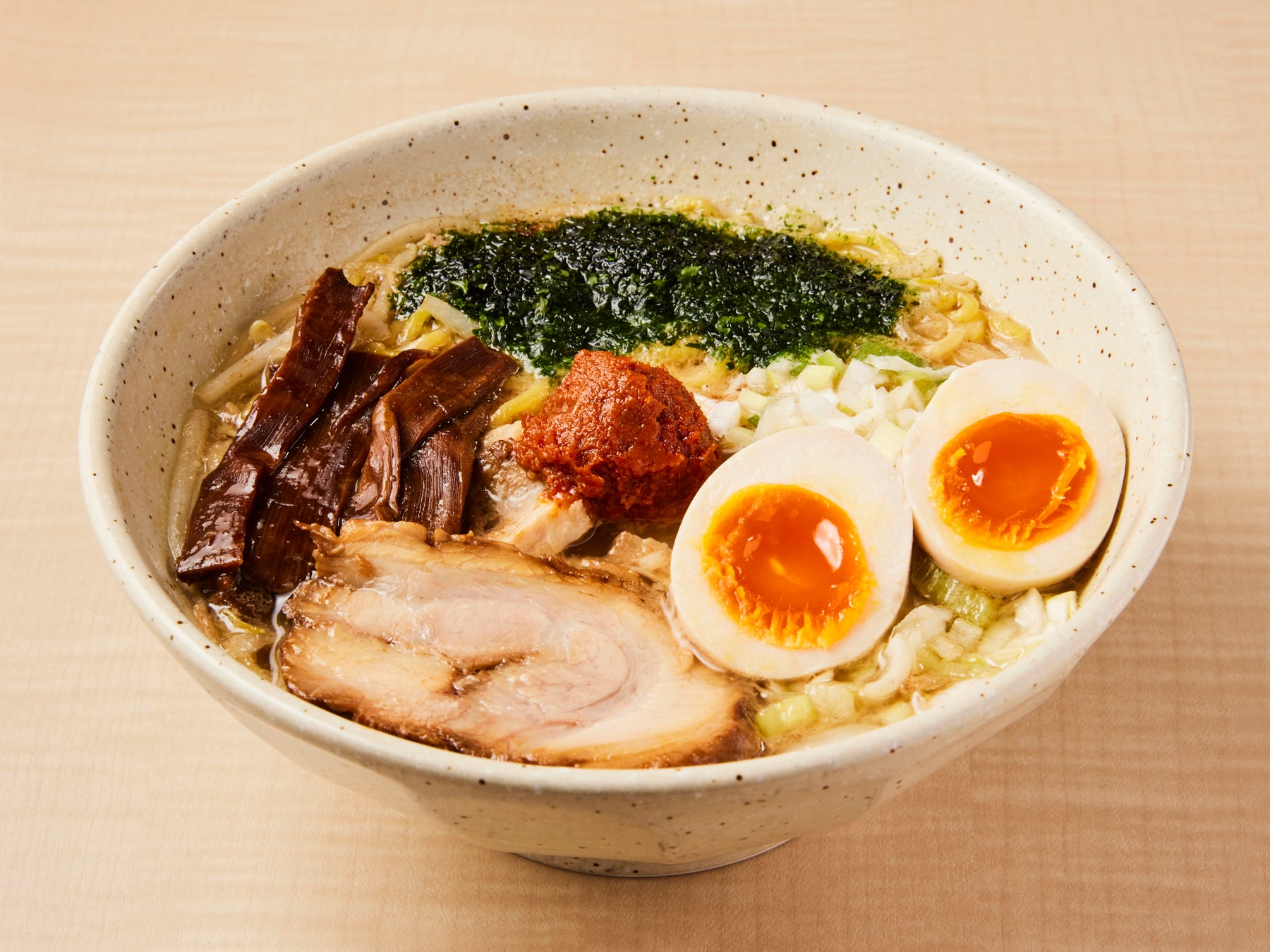 俺式の豚骨スープに豚の白もつと特製の辛味噌と合わせ味噌を加え、風味豊かな味噌ラーメンに仕上げました。