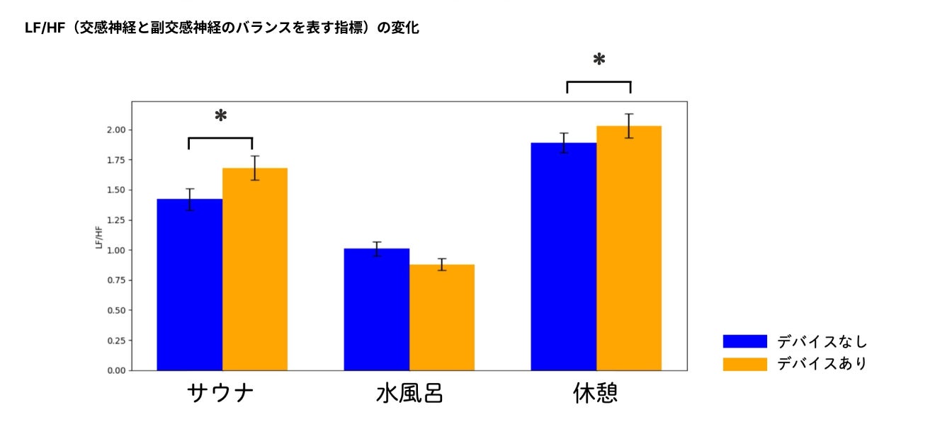 休憩中に「ston s」を使用することで、サウナ室と休憩室における自律神経活動量向上の傾向が見られた。