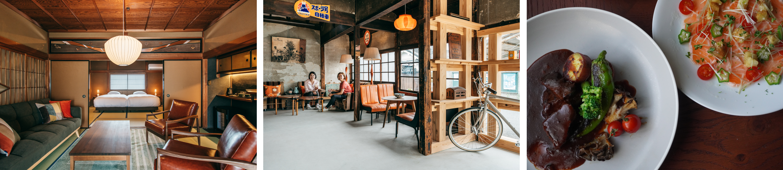 一方、「宿チャリンコ」は、当時の自転車屋の面影を残す古民家を、サイクリストが集う昭和レトロな空間に改修。自転車を乗り入れられる客室や、レンタサイクルもご用意し、自然と歴史情緒あふれる御所のサイクリングを思う存分楽しんでいただけます。