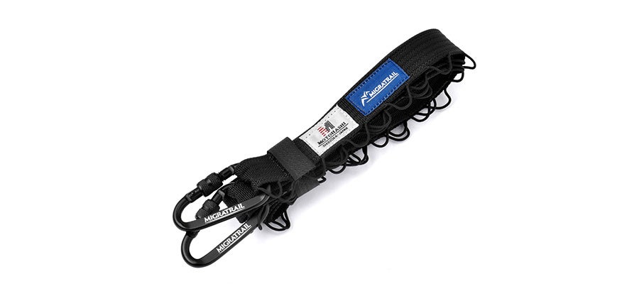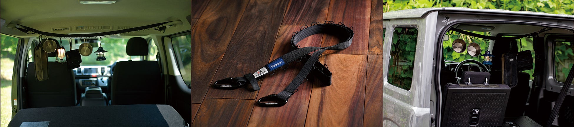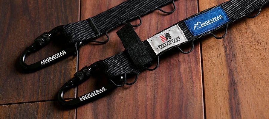 キャンプや車中泊で散らかりがちな食器・ランタン・衣類等を吊せる日本製デイジーチェーン。1ループで30kgまで吊す事が可能な強度を持ちながら、商品の総重量は77gと超軽量。静岡県にある老舗テープ製造メーカ「本橋テープ」と「ミグラトレイル」のコラボレーションモデル。