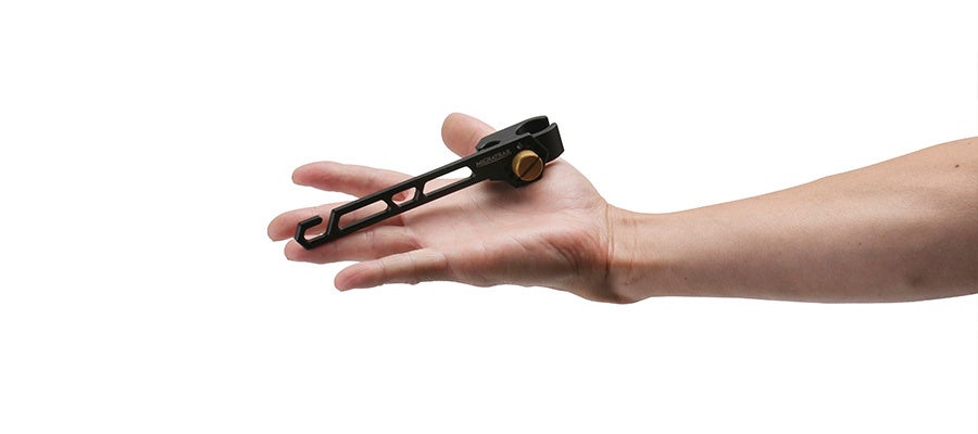 携帯性を考慮し軽量なアルミニウム合金製のカラビナを採用。本橋テープ タフフック約185gに対し、タフフック ファントムブラックはベルトを含めた全重量が77gと超軽量。また、ベルトの脱落を防ぐようカラビナにスクリューロックを配置し、安心して重量物を吊るす事が可能。