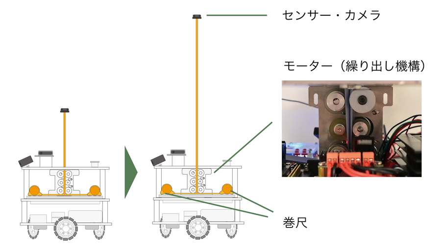 巻尺の仕組みを利用し40cmから2mの高さまでセンサーやカメラを昇降可能