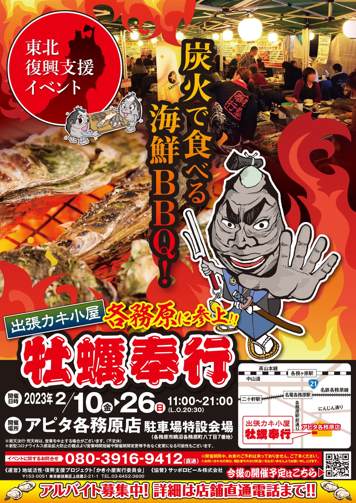 出張カキ小屋「牡蠣奉行」は東日本大震災で被災した宮城県石巻市の牡蠣を多くの人に食べてほしいと冬季限定の東北復興支援イベントとして全国各地で展開。2月26日(日)までの毎日営業。昨年に続いて2回目の開催。