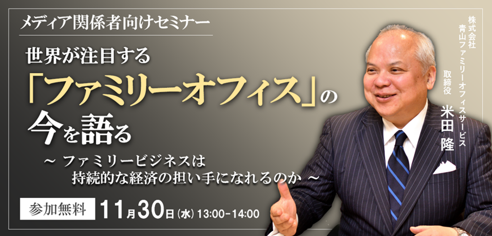 株式会社青山財産ネットワークス(以下:当社)のグループ会社である株式会社青山ファミリーオフィスサービスは、「世界が注目するファミリーオフィスの今」と題し、メディア関係者向け勉強会を2022年11月30日(水)13時~開催いたします。