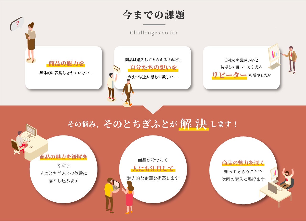 地域の魅力を発信したい事業者様の商品に想いをコンテンツ化してそのとちぎふと上に掲載し、地域特産品等に興味を持っているユーザーが商品とコンテンツを併せて楽しむプラットフォームである。