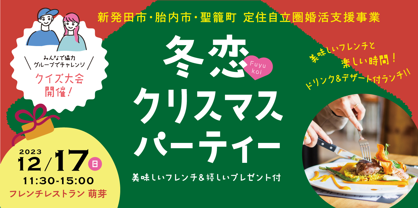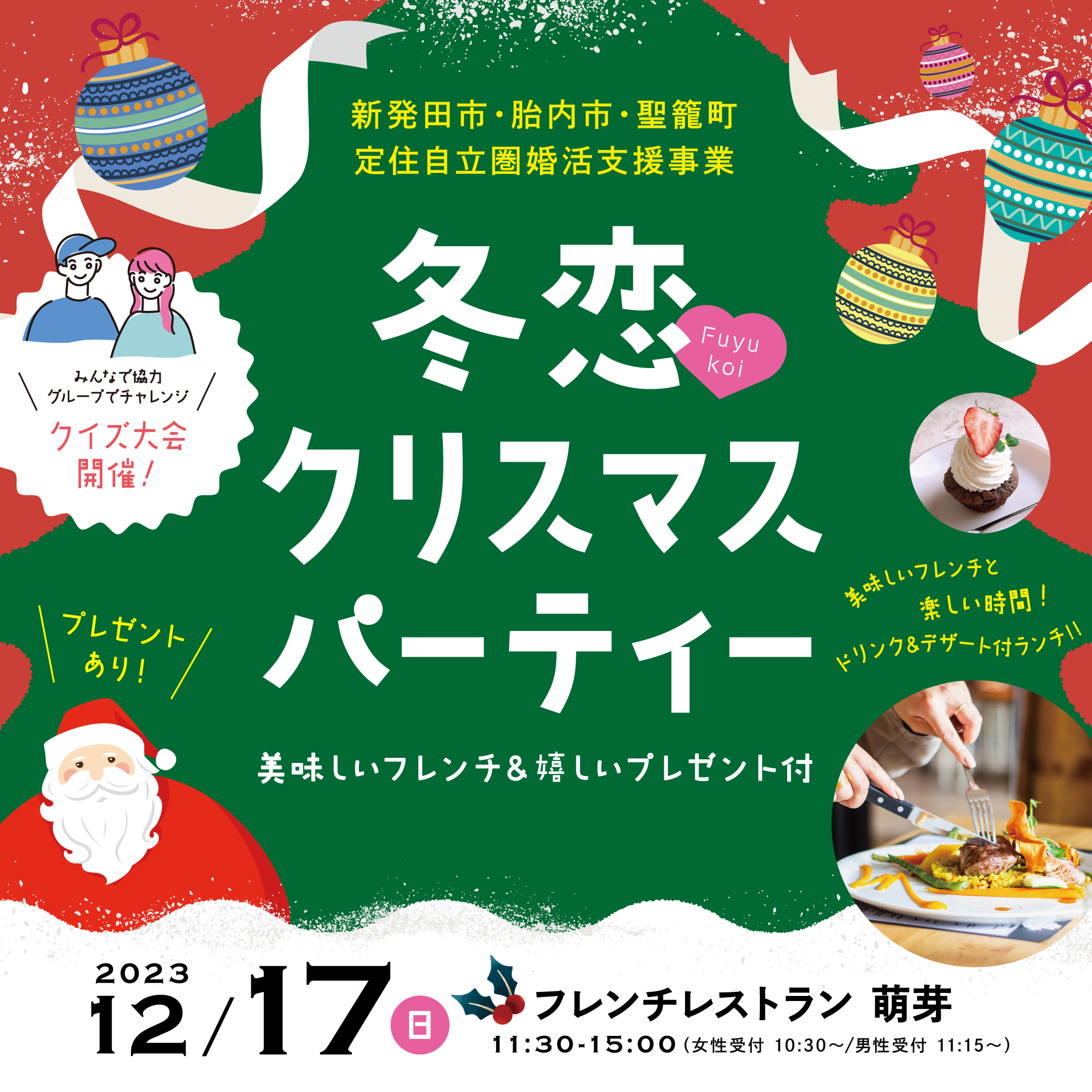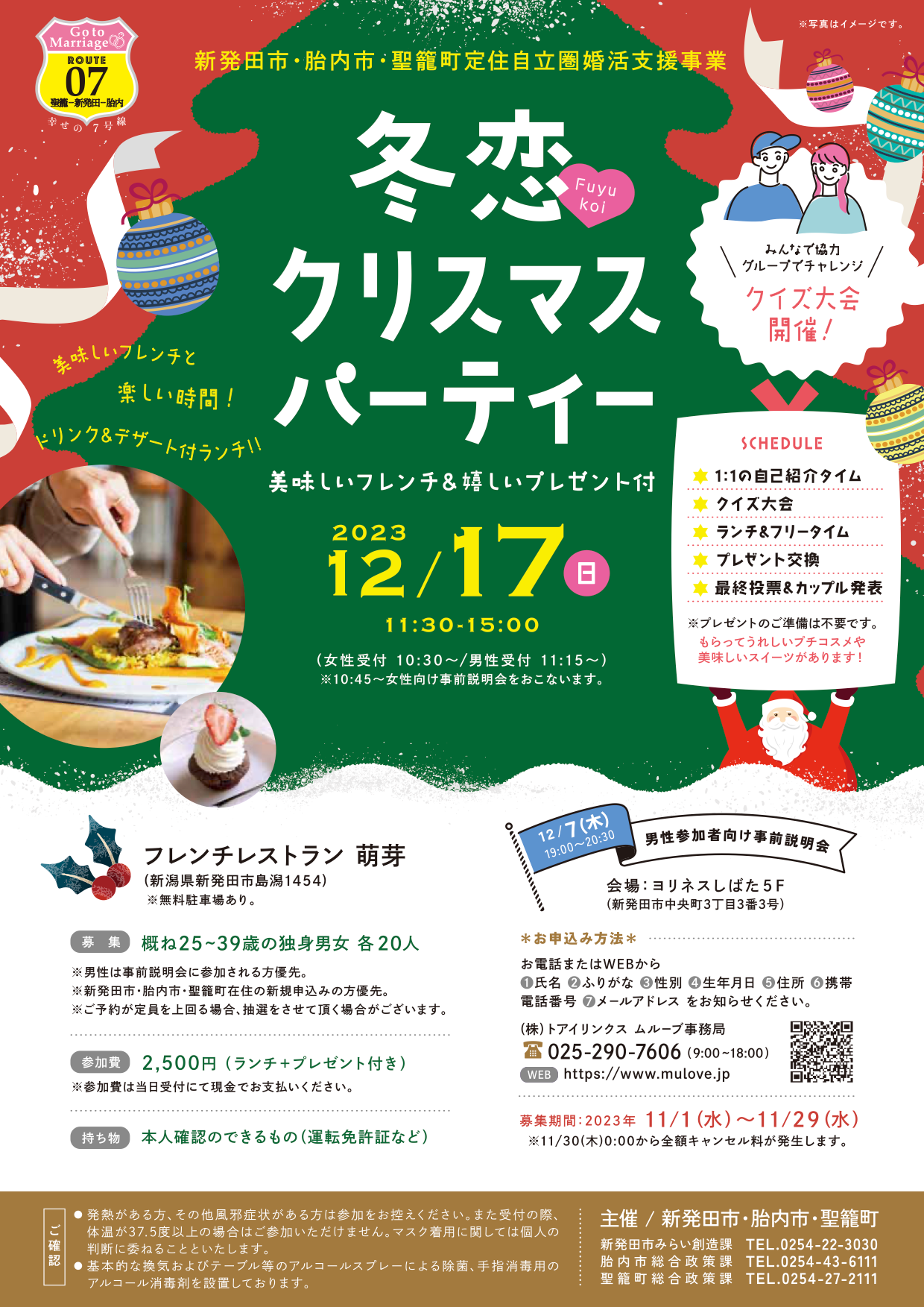 2023/12/17(日)新発田市・胎内市・聖籠町定住自立圏婚活支援事業:冬恋 クリスマスパーティー 美味しいフレンチ&嬉しいプレゼント付を開催します