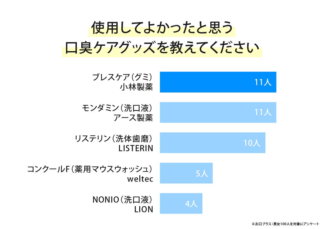 男女100人に使ってよかったと思う口臭ケアグッズを聞いてみたところ、小林製薬の「ブレスケア(グミ)」、アース製薬の「モンダミン(洗口液)」が同数で1位でした。
