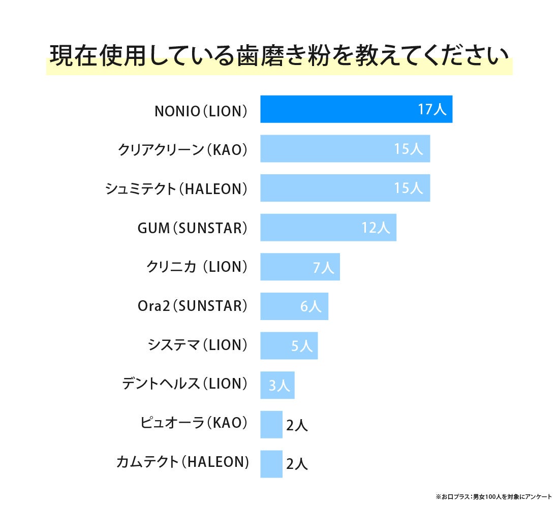 男女100人に現在使用している歯磨き粉を聞いてみたところ、LION「NONIO」が約2割を占めて最多でした。