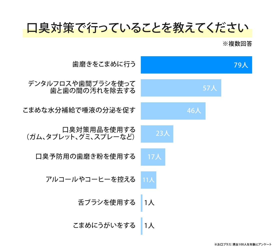 男女100人にどのような口臭対策を行っているかアンケート調査をとったところ、もっとも多かったのは「歯磨きをこまめに行う」でした。